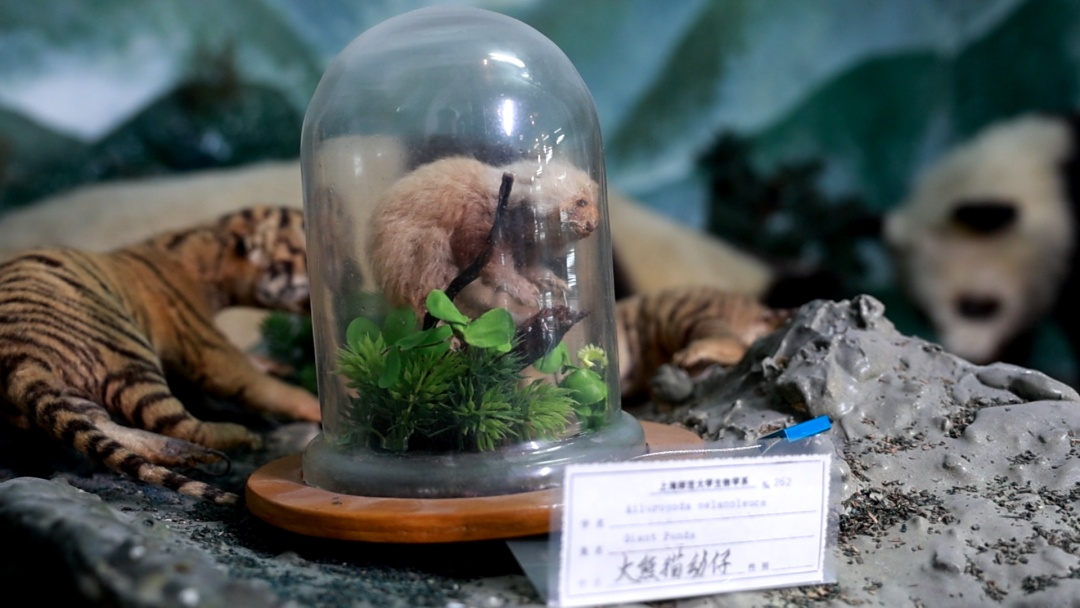 在生物标本馆里还有很多大型动物的标本,这在高校里面是非常稀有的。当然这些动物标本,都是生命科学学院的老师在20世纪用死掉的动物尸体做的,所以是合法合规的。其中比较珍稀的有大熊猫标本,特别是其中一只大熊猫的幼崽,只有三周左右,外形看上去像一只小老鼠,只长出一点绒毛。