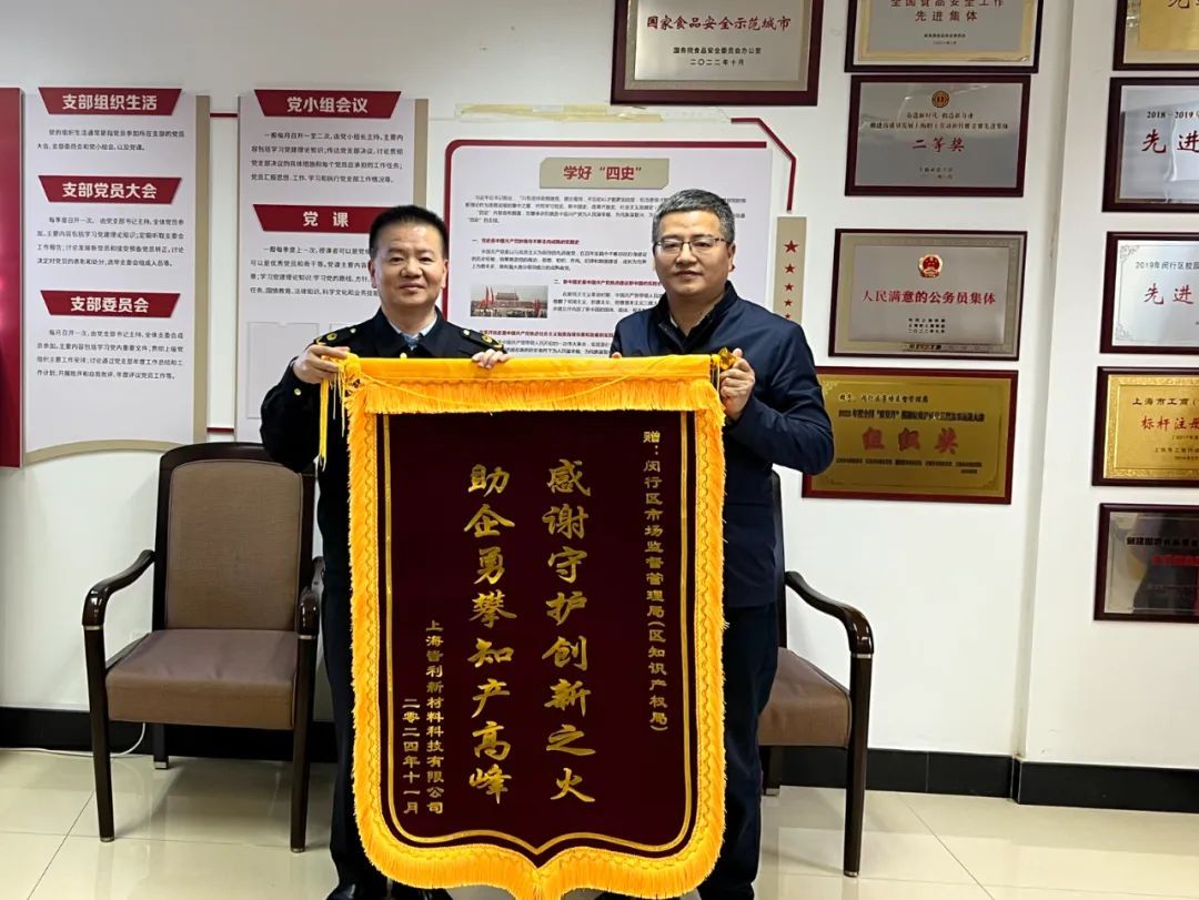 近日,上海皆利新材料科技有限公司专程来到闵行区知识产权局,赠送“感谢守护创新之火,助企勇攀知产高峰”锦旗。