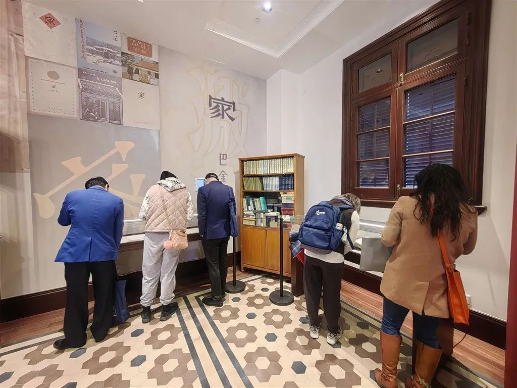 走进木质大门,映入眼帘就是“把心交给读者”六个大字,这是巴金先生的文学精神,也是他一直保有的赤子之心。大厅右侧是巴金与上海文献图片展,以巴金在上海的居住地为线索,梳理了他不同时代的重要文学创作、翻译的作品,其中《激流三部曲》(《家》《春》《秋》)《随想录》是其中的重点,有各种版本、手稿的展示,还有巴金与他的作品译者之间的通信等,从片段和细节感受巴金创作的丰富。