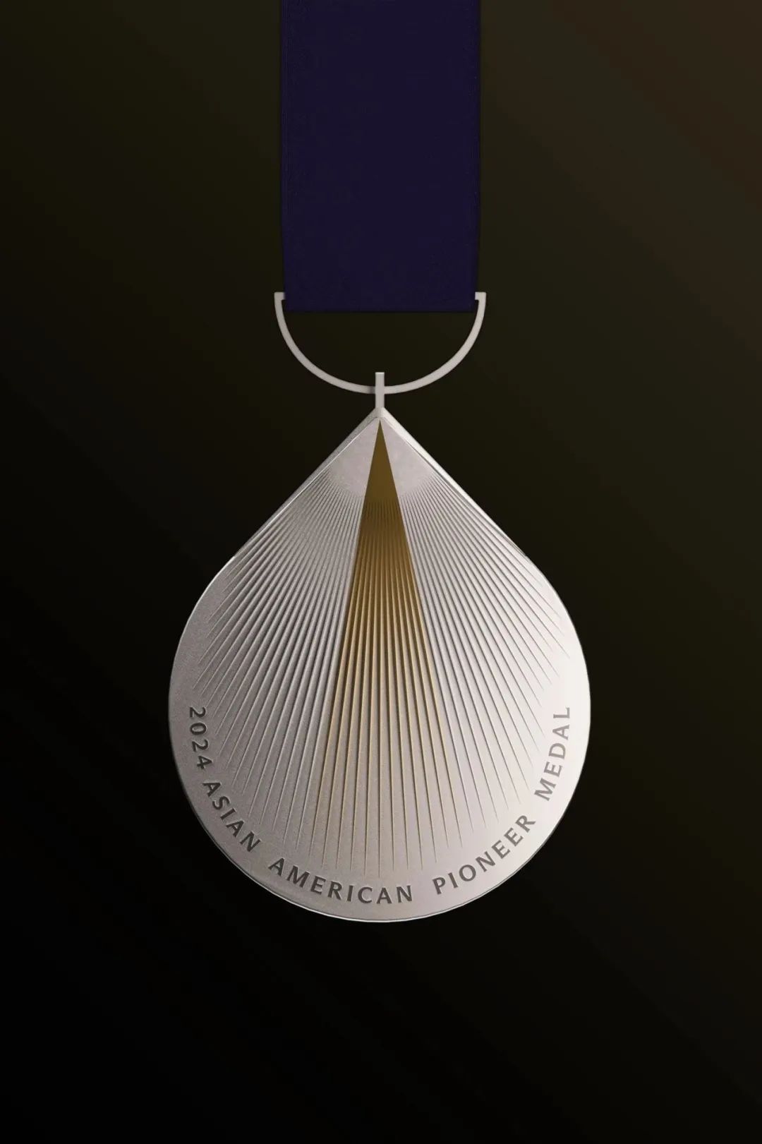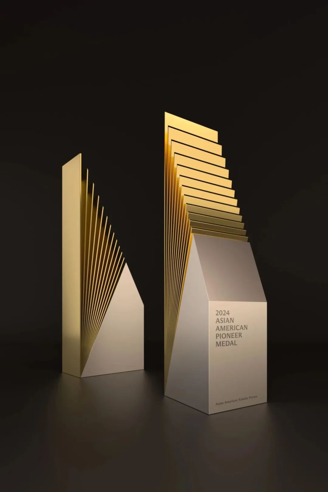 此次为美国亚裔先锋奖章设计奖杯和奖章,王敏大师工作室从“理性、探索、求真”的价值观出发,奖杯以经典的方碑形式为基础,通过百分比形体切割,形成了独特的形态结构。奖章的设计则延续了奖杯的语言,以金色与银色两种材质的放射线条呈现百分比数据,简洁而富有深意。