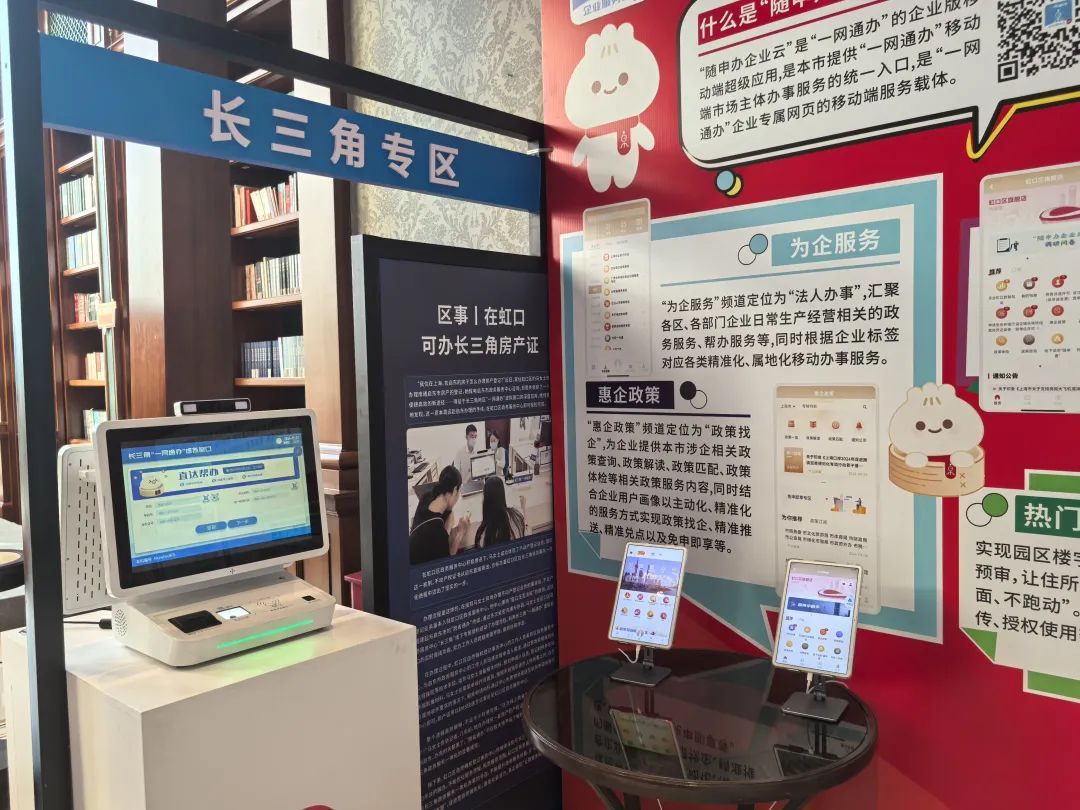 现场,市级“一网通办”吉祥物小申与虹口区“一网通办”吉祥物小虹携手登场,通过展板陈设形式,为企业提供可视化、立体化、沉浸式、体验式的政策解读和服务展示。