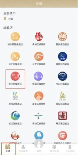 也可以登录“随申办”企业云APP后,点击“区域”,选择“虹口旗舰店”点击进入。