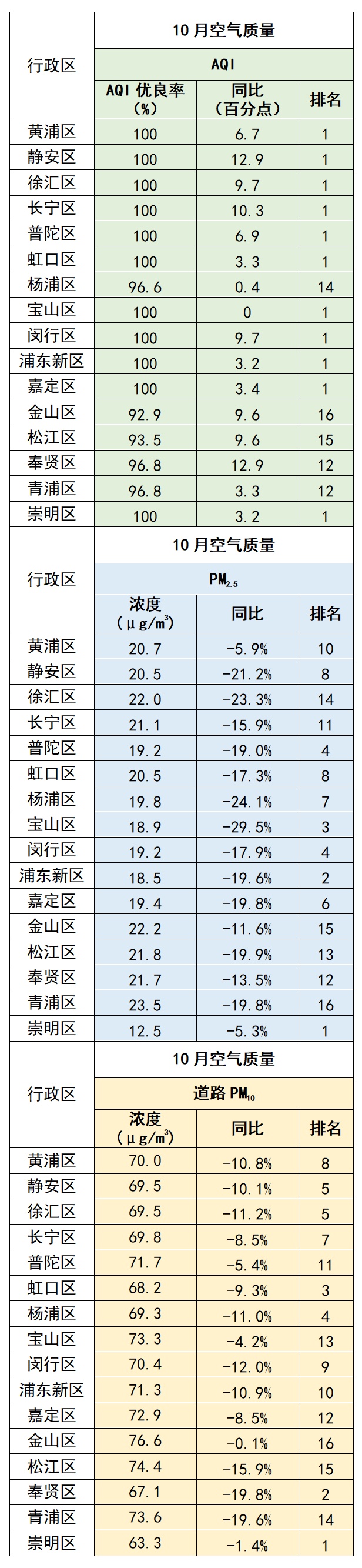 今年10月,上海未出现污染日,空气质量指数(AQI)优良率为100%,较去年同期增加6.5个百分点;细颗粒物(PM2.5)月均浓度为20微克/立方米,同比下降16.7%;道路可吸入颗粒物(PM10)移动监测月均浓度为71微克/立方米,同比下降10.1%。