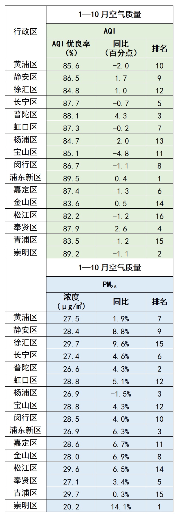 注:(1)AQI优良率和PM2.5浓度数据来源为本市19个国控城市点位,其中浦东新区4个点位,其他区各1个点位。