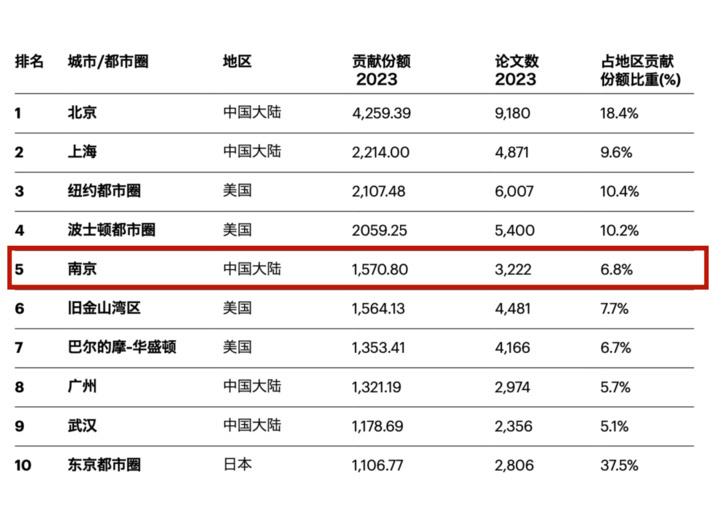 自然指数-全球科研城市十强南京排第五
