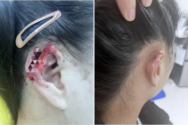 事故发生后,她被紧急送往该院。外六科(神经外科)接诊医生发现,她的右侧耳廓自耳垂上方向上撕脱,耳廓背面几乎完全离断,仅有一小部分皮肤与断耳相连,断缘不整齐,耳廓主要供给动脉均完全离断,已出现明显缺血表现。
