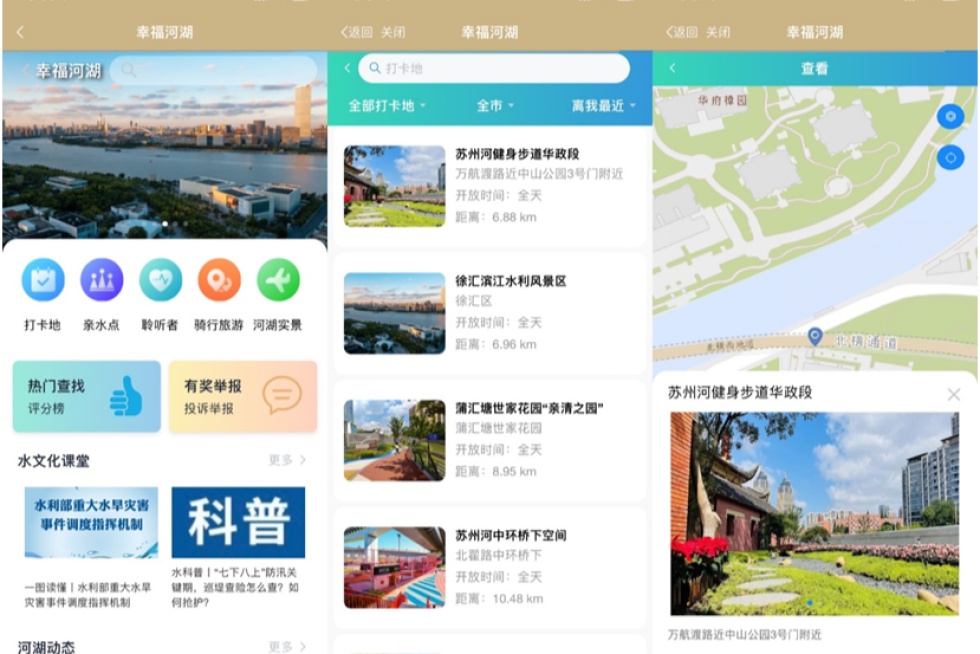除此之外,“幸福河湖”还构建了多样化的专题服务,包括水文化历史、水环境保护知识以及滨水骑行、旅游路线等。市民游客可在“随申办”APP内搜索“幸福河湖”进入,或在微信、支付宝“随申办”小程序中使用。