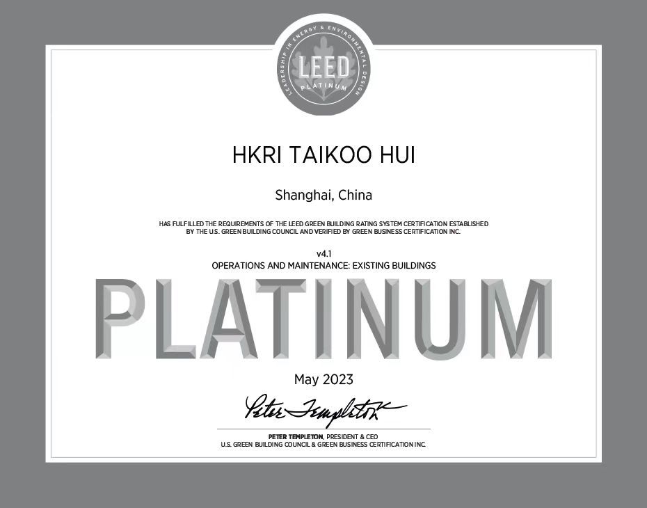 兴业太古汇“LEED 运营与维护:既有建筑”V4.1铂金级认证