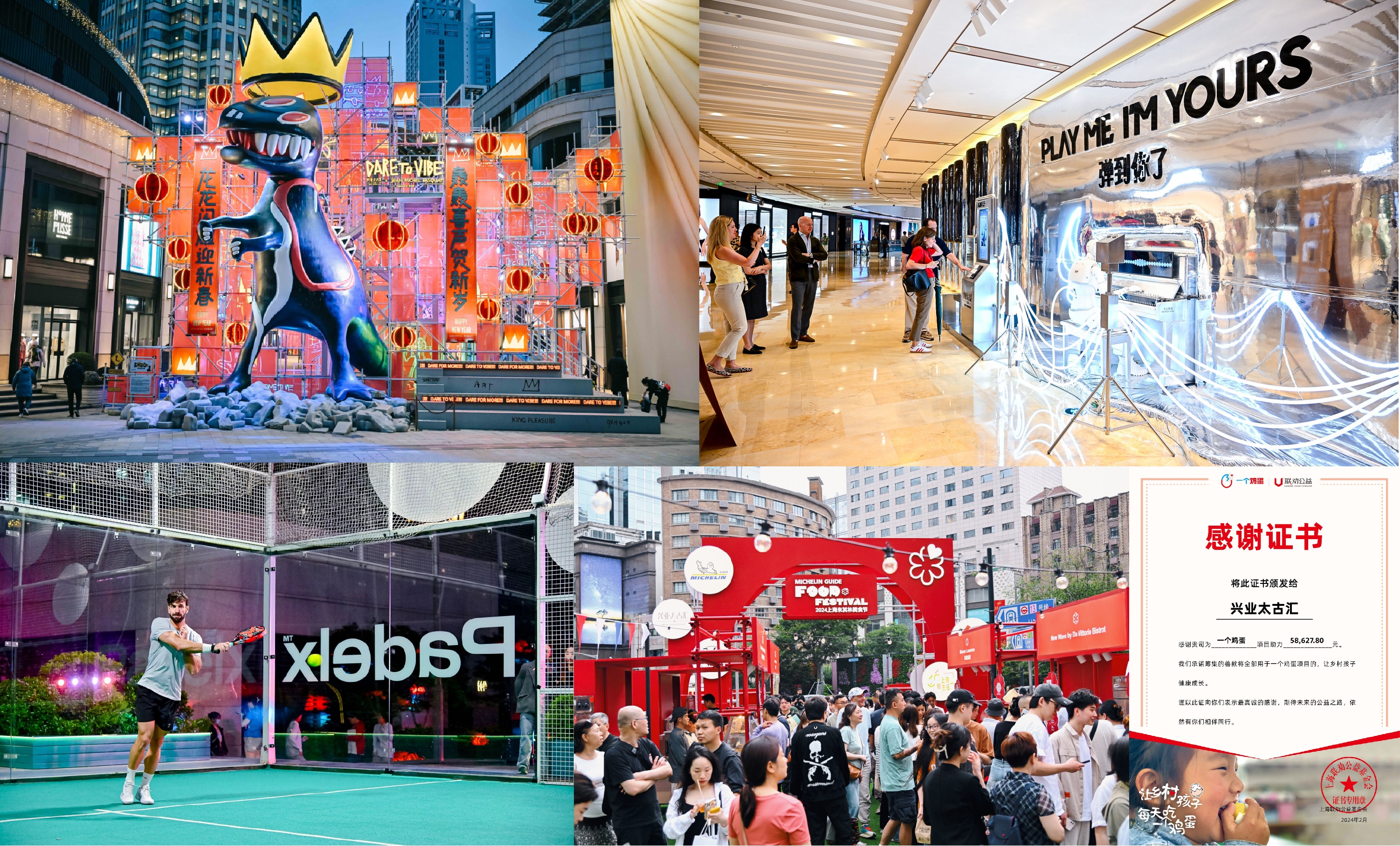2018年,兴业太古汇首次将“Play Me, I'm Yours”国际公益钢琴活动引入中国,开启链接艺术理念与可持续城市生活的商业篇章,并连年推出国际艺术、数字展览、运动社交、文旅市集等多元活动,如在冬日活动季中联合让-米歇尔·巴斯奎特基金会,打造巴斯奎特经典作品《戴皇冠的小恐龙》大型同名艺术装置,并让巴斯奎特的“足迹”借由不同形式遍及全域;引入大空间沉浸式探索项目《消失的法老》亚洲首展,带来前沿数字文旅体验;打造中国内地首届米其林星食节,呈现全新的高端美食文化;加入上海联劝公益基金会“一个鸡蛋”公益项目,2020年至今每年坚持为国内欠发达地区的学生赞助提供为期一年的鸡蛋支持,关怀乡村孩子的健康成长等等。兴业太古汇将文化以多样化形式带入社区,期待延续并传承百年南京路的文化魅力。