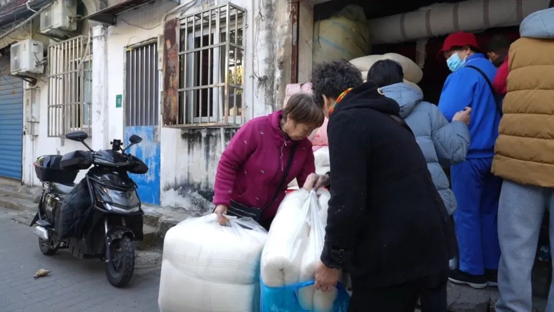 11月27日,记者在南翔老街看到,一家不起眼的弹棉花店门口聚集了不少人,其中以阿姨爷叔居多,他们或拎或抱,手中大多带着自家的老棉花被,准备请老板帮忙翻新。