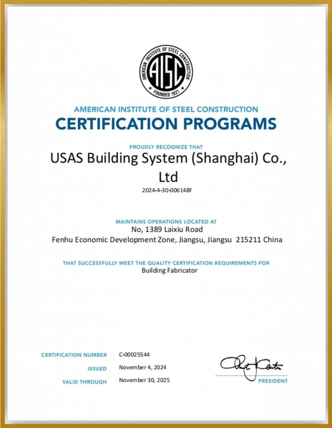 据了解,AISC是美国钢结构协会(American Institute of Steel Constrction)的简称,是一家非营利性质的技术协会和贸易组织机构,成立于1921年,总部位于美国芝加哥。AISC是世界上最权威的认证标准之一,取得AISC认证对于国内企业打破技术壁垒、开拓国际市场具有重要意义。