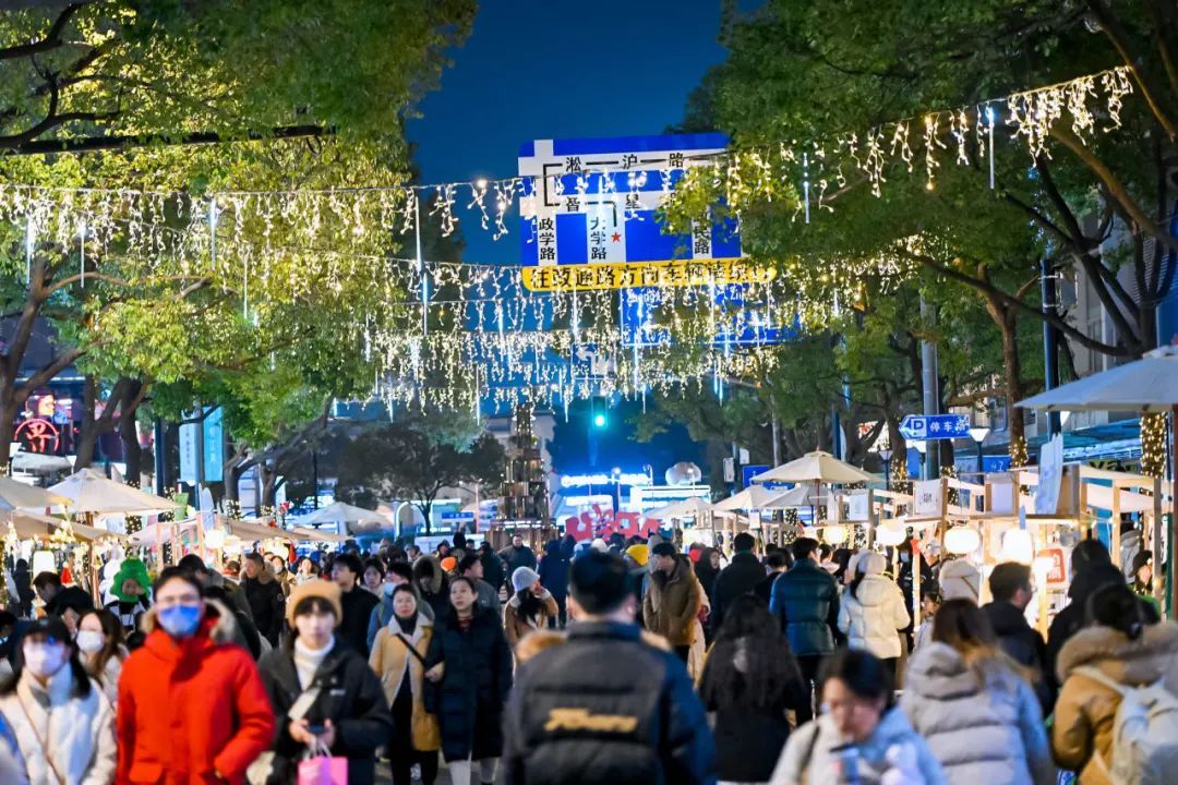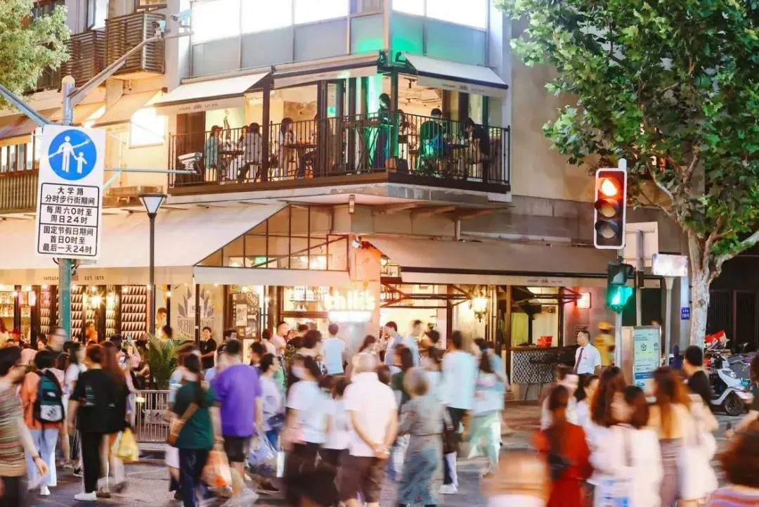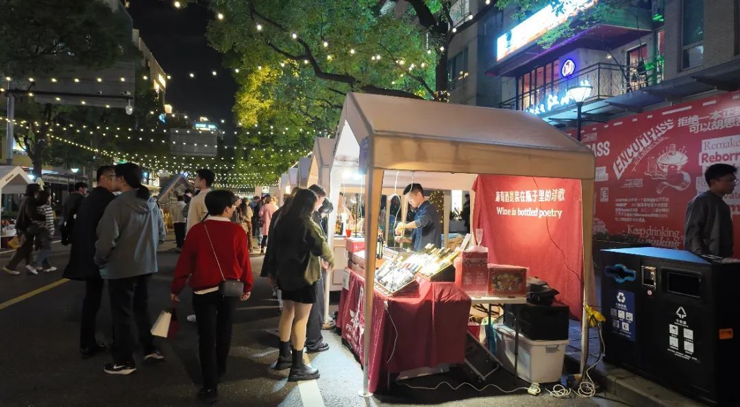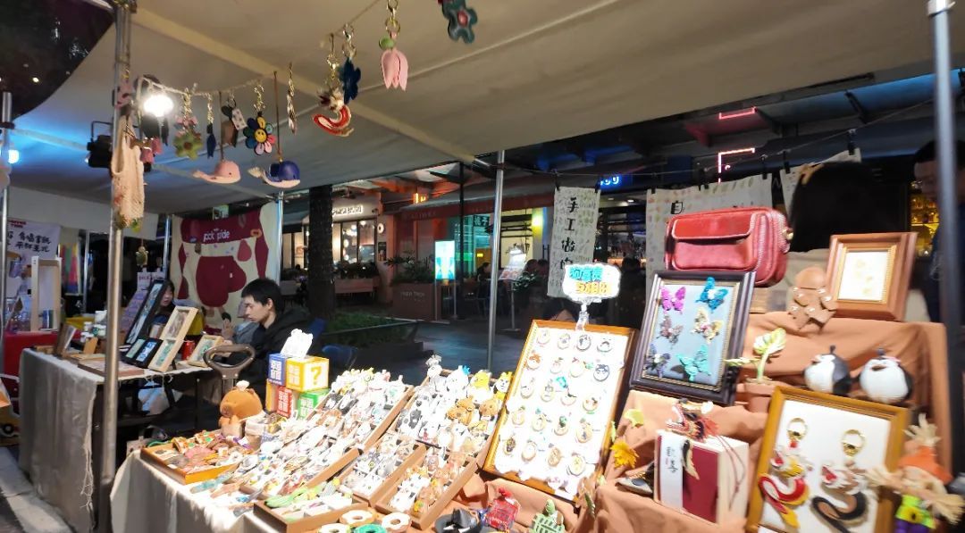 道路两旁,点点灯光串联成线,门店外悠闲而坐的客人,各式精致的手工艺品展示,冒着香气的小食和咖啡,种种元素交相辉映,在井井有条的环境里,营造出大学路街区,优雅而独特的文化商业氛围。