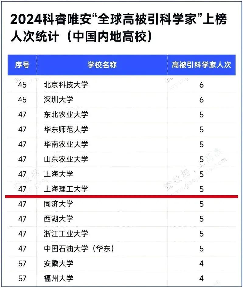 近日,科睿唯安2024年度“全球高被引科学家”名单公布,共有来自全球59个国家和地区1200多个机构的6636名科学家入选。上海理工大学共5人次入选,位列中国内地高校第47位。 上理工智能科技学院顾敏院士团队入选1人次:顾敏院士入选的学科领域为交叉学科。能源材料科学研究院窦世学院士团队入选4人次:窦世学院士入选的学科领域为化学学科、材料科学学科,刘化鹍院士入选的学科领域为材料科学学科,Bao Qiaoliang入选的学科领域为交叉学科。 此次中国内地上榜人数再次大幅增加,共有1405人次(占比为20.4%),继续位列全球第二。中国内地入选榜单的学者在过去十年间均发表了多篇高被引论文,其被引频次在Web of Science中位于同学科前1%,彰显了他们在同行之中的重要学术影响力。2018年以来,中国内地科学家在全球高被引科学家中所占比例从7.9%上升至现在的20.4%,这反映了科研全球化正推动高层次科研和学术贡献实现重要的全球发展再平衡。 “高被引科学家”是由科睿唯安文献计量学专家基于Web of Science数据库,通过对自然科学和社会科学领域等21个学科领域的引文数据分析得出,该名单遴选出了各领域中高被引论文数量最多即受到全球同行集体认可的、最具引文影响力的科研人员。