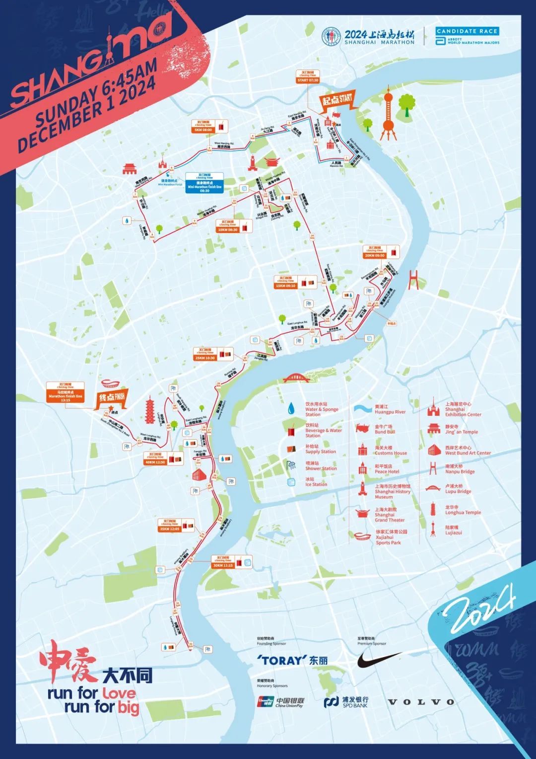 2024上海马拉松以“申爱大不同 Run for love, Run for big”为口号,将于12月1日7点鸣枪起跑,参加全程马拉松及健身跑项目的所有跑者将同枪起跑。对标马拉松大满贯赛事要求,竞速轮椅项目将于6:45率先起跑。