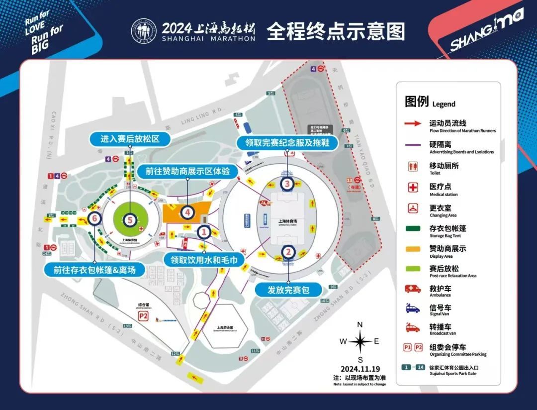 全程马拉松项目终点设置在徐家汇体育公园庆典广场,跑者由徐家汇体育公园12号门进入,经久事体育大厦和体育场7号扶梯后抵达终点,冲线后途径火炬台由体育场4号通道进入场内领取相应完赛物资、完赛奖牌和完赛包后由上海体育场1号通道离场后沿内部道路向西前行,经过赞助商展示区后,根据取衣帐篷编号的指引,至对应的取衣帐篷领取自己的存衣包。