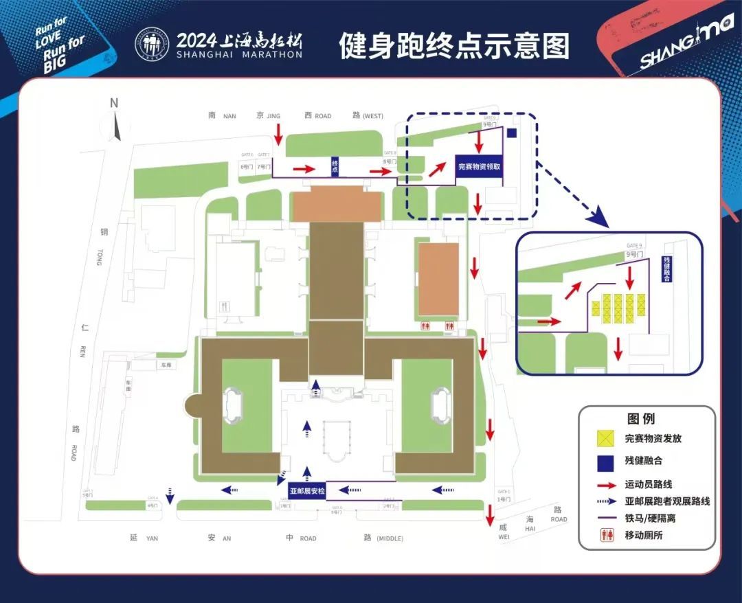 参加健身跑的跑者则由南京西路跑进上海展览中心,冲过终点门头后,可以领取自己的完赛奖牌及完赛物资。领取自己的完赛奖牌和完赛包后由上海展览中心1号门离场,沿延安中路向西南前行可至地铁2/7/14号线静安寺站。