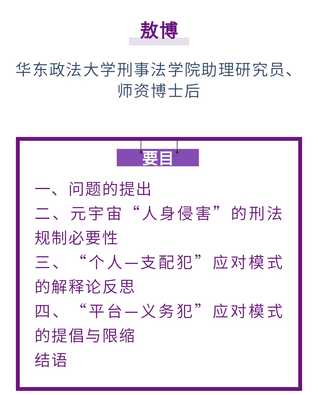 元宇宙在带来新的发展机遇与互动方式的同时,也潜藏着“人身侵害”的风险。元宇宙有限沉浸性所引发的深度冒犯是刑法介入元宇宙“人身侵害”的法理依据,社会控制理论、社会学习理论则为刑法介入提供了犯罪学上的理由。“个人—支配犯”的应对模式在解释论上无法成立,元宇宙“人身侵害”不符合绝大多数侵犯公民人身权利犯罪的构成要件,且因匿名性带来的认识错误问题进一步限缩了此类犯罪的适用空间。以义务犯理论为基础并考虑到平台履行积极义务的优势,应以“平台—义务犯”作为元宇宙“人身侵害”的刑法应对模式,从义务类型、功能需求、行刑衔接三个方面对拒不履行信息网络安全管理义务罪作解释论上的限制,同时充分发挥软法的引导功能与行政法的管控功能,使拒不履行信息网络安全管理义务罪居于“备而慎用”的状态,以实现对元宇宙“人身侵害”的合理规制。