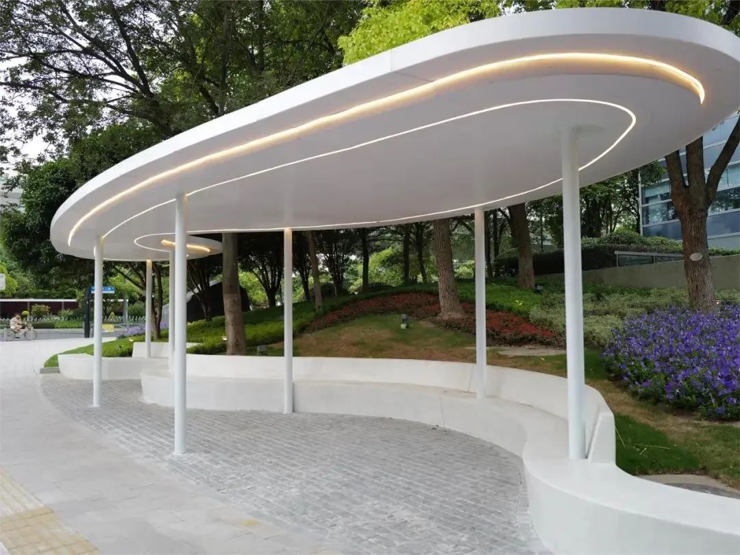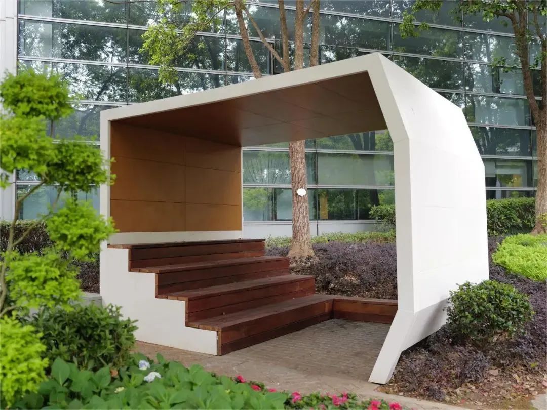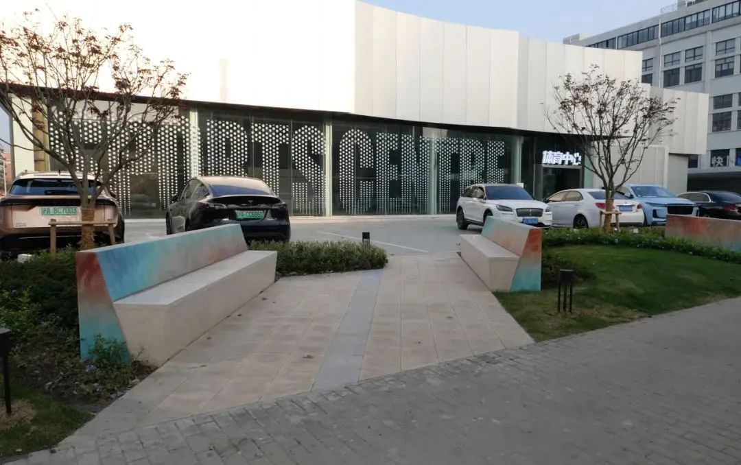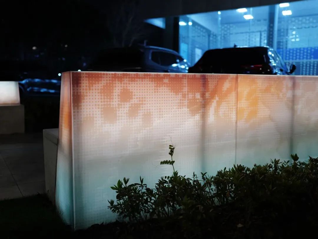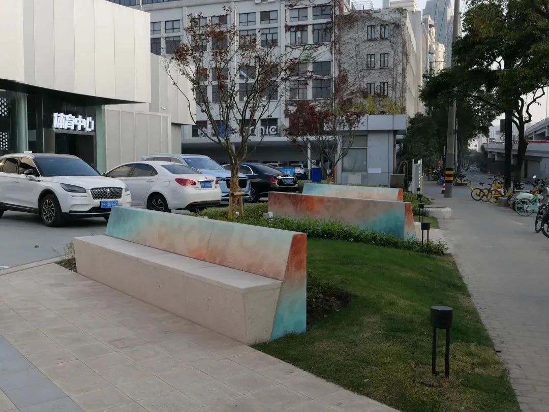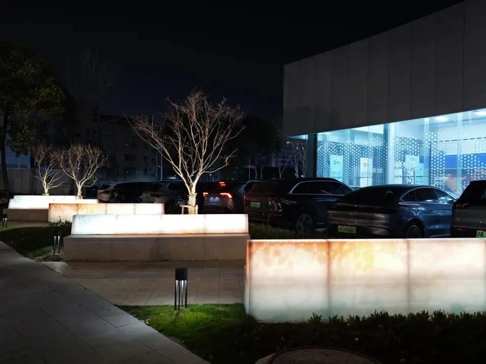 杨浦区黄兴路1618号 长阳创谷体育中心附属绿地 长阳创谷体育中心附属绿地 位于体育中心外侧 面积约300㎡ 经过改造蜕变 如今成为充满活力 兼具美观与实用的公共空间 既提升了体育中心的整体形象 也为市民提供休闲和交流的场所 座椅的内透光设计 兼顾夜景灯光效果 夜幕降临时 座椅化身通灵的景观小品 不仅为绿地带来必要亮化 更以独特的光影效果 打造夜色中亮丽的风景