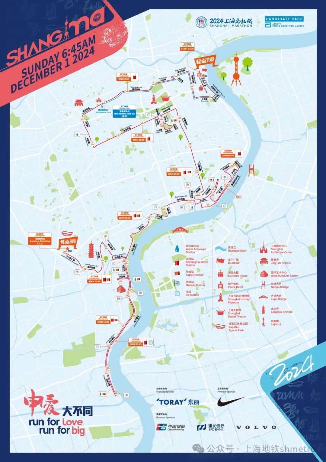 2024年上海国际马拉松赛将于12月1日(周日)6:45点鸣枪起跑,此次上马全程路线,途经或临近的地铁车站有:南京东路站、豫园站、人民广场站、南京西路站、静安寺站、常熟路站、陕西南路站、淮海中路站、一大会址·黄陂南路站、大世界站、老西门站、陆家浜路站、西藏南路站、南浦大桥站、世博会博物馆站、龙华中路站、龙耀路站、云锦路站、龙华站、上海体育馆站、上海游泳馆站、上海体育场站等,您的支持者可以提前搭乘地铁从这些车站出站观赛,为您助威。