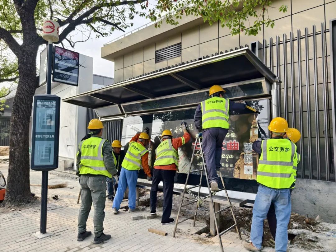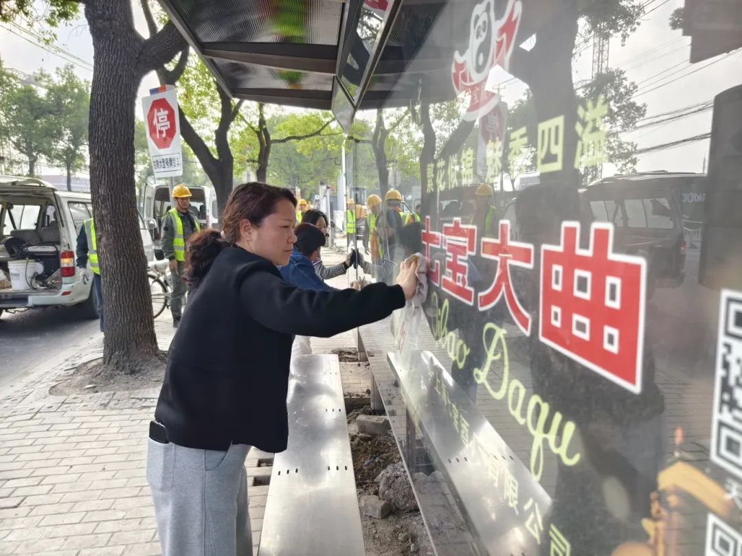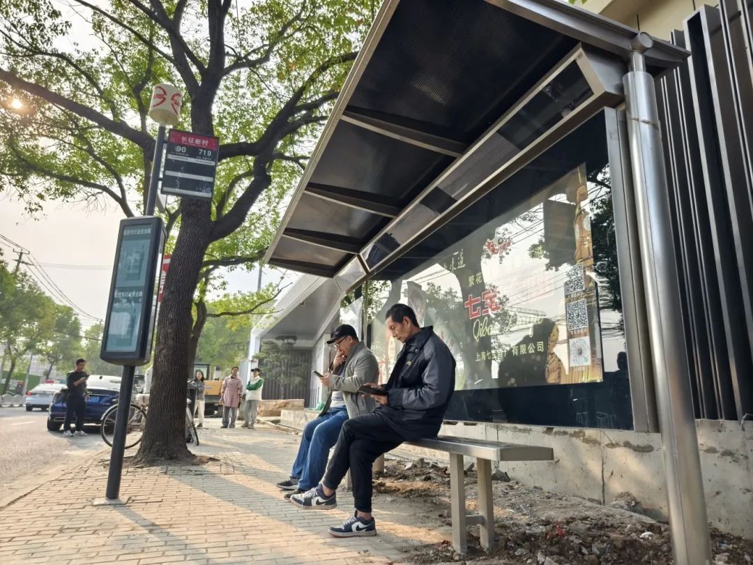 近日,宝山区淞兴西路北侧的一个公交车站完成了搬移,工人们将不锈钢结构的公交候车亭稳稳地安装在人行道上,吴淞街道第一街区党支部成员和一纺居委会的干部也拿来了抹布,麻利地将公交候车亭立面和不锈钢座椅擦拭得干干净净。