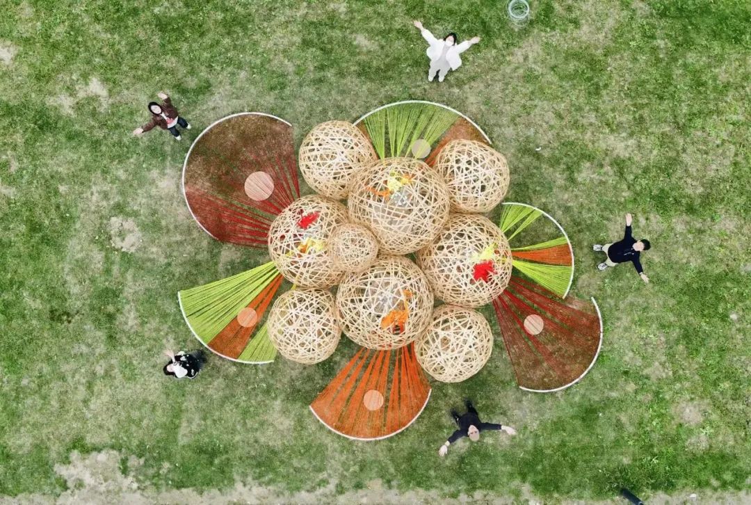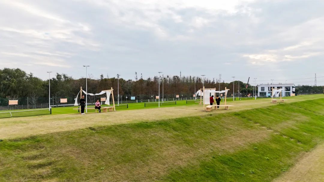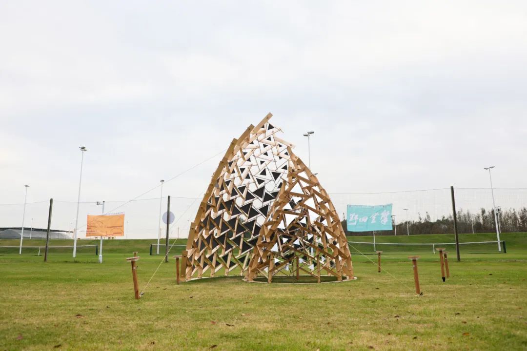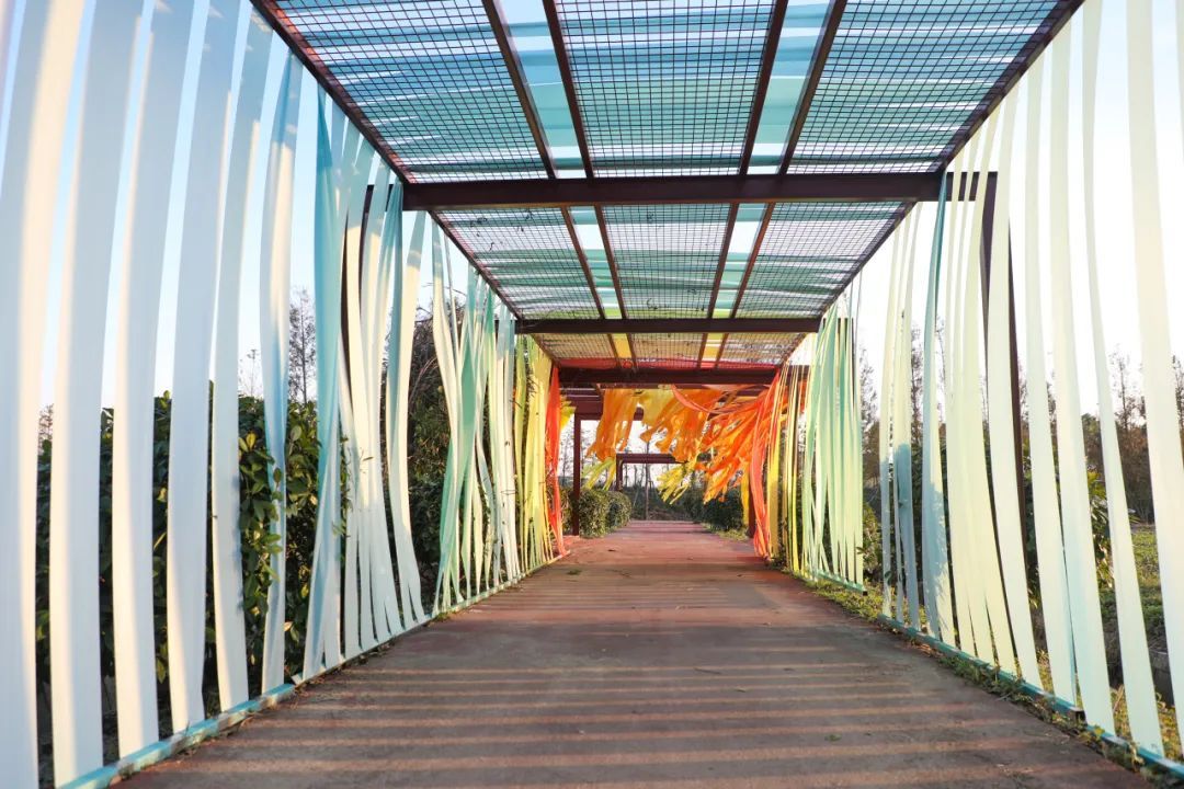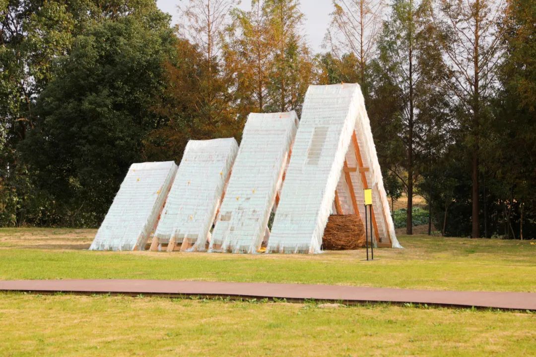 十一月,中央美术学院、中国美术学院、清华大学美术学院、广州美术学院、鲁迅美术学院、四川美术学院、西安美术学院、天津美术学院、湖北美术学院、上海大学美术学院共十所全国美院设计团队相继来到南桥镇南庄路沿线乡村,为“摩登田野2024:摩登南庄·乡村艺术走廊计划”布展,助力乡村振兴发展。 相信大家对活动期间的无人机表演、灯光秀、集市、美育活动仍意犹未尽。虽然,“摩登田野2024”的部分活动已经落幕,但是南庄路沿线的13种艺术装置仍在展出中!所有的艺术装置将持续展出至12月20日左右,大家可以继续打卡参观。 十大美院在地艺术装置导览图 • 在参观前,您可以通过以下介绍提前在线上身临其境地了解艺术装置的创作灵感。 • 《呀!鸭棚》 中央美术学院 《呀!鸭棚~》采用了自然乡村元素与现代城市生活相融合的造型,取现代社交新空间——帐篷的形象,用简化成木质框架结构表现,外表附上现代感十足的七彩反光条带,内里放置一个鸭子形象和一个巨大的铺满稻草的鸭窝,人们可以钻、爬、躺与其互动,享受快乐休闲时光的同时体验“偷蛋摸鸭”的乡村童年意趣,唤起村民的遗忘的美好回忆。作品通过对乡村元素的艺术设计和各种材料的融入,使之成为既具有乡村自然美感又充满创意的装置艺术。 · • · 《望野》 中国美术学院 作品《望野》基于场地的需求,尝试着做了一组休闲座椅,既能遮阳避雨,又能眺望稻田和夕阳。设计将木质杆件和幔布结合,提供休憩基础上注重观赏性,悬挂的纱布融入当地撕纸技艺,使景观设施具有独特的江海地方文化。其与网球基地、稻田、夕阳等成为摩登田野的一道亮丽风景。 • 《六季稻语》 清华大学美术学院 项目根据良渚文化玉琮的样式展开,旨在通过较小程度的干预,以温和的姿态介入现有场地,将种稻这一项古老而持久的生产活动以景观化的方式呈现,尝试营造一种生长于大地,最终也消解于大地的艺术景观。通过此次艺术实践,我们期望激发当地居民及远道而来的游客对乡村田园的共同记忆,追溯人类对大地最本真的感知与联系。 · • 《星火永恒》 广州美术学院 本装置以奉贤滚灯为原型,通过凝固滚灯表演过程中火光飞溅的瞬间,表达对风调雨顺、五谷丰登的愿景,寓意奉贤文化薪火相传,匠心永恒。装置学习采用奉贤滚灯的编织工艺,牵拉彩线形成一个“日常”聚会的全新场域。新的空间带来了“非常”的光影感受,使人们能够多角度观察,切身感受舞者视角及滚灯的材质触感,获得更真实的体验,拉近了传统文化与日常生活的距离,也激发了人们对传统艺术的理解与兴趣。 • 《梦回良渚》 鲁迅美术学院 “梦回良渚”紧密结合在地性,旨在探索在地文化与艺术设计之间的链接。步入其中即被良渚文化信息围合,亚克力材质的折射,让人在镜面中既看到自我形象,又看到良渚文化符号,二者折射于同一面镜中仿佛同处一片镜面时空,仿佛与千年前的良渚人民有所共鸣。 · • 《七彩江海》 四川美术学院 通过彩色塑料布等材料来操纵阳光,使色彩变化为装置增添了丰富的视觉冲击力,营造缤纷的光影视觉效果——缤纷的多彩光影是装置的灵魂所在。借助廊道本身具备的空间属性,为观者打造出具有沉浸式体验感的光影氛围空间。使“百亩彩稻”的游览点位从视觉效果上能从环境中得到凸显。 · • · 《奇遇记》 四川美术学院 作品选择“奇遇”作为创作主题,通过描绘了一群欢快动物的嬉戏场景,展现出一个奇幻的平行世界。在这个世界中,各种动物在阳光下自由自在地玩耍,彼此之间没有隔阂,展现出无尽的欢乐与和谐。作品不仅是对想象力的展现,更是对生物共性的一种深刻隐喻。 • 《芃芃》 西安美术学院 “芃芃”“有‘芃’自远方来,不亦乐乎”“芃”字也代表着奉贤乡野欣欣向荣之态,并通过巧妙地利用当地废弃的材料,赋予了这些材料新的生命,同时还确保了装置的高耐久性和经济实惠。在造型上升腾效果与周围的稻田环境相融,仿佛是大自然的一部分,既突显了乡野的自然之美,又体现了可持续发展的环保理念。通过这种方式,我们希望能够在保护环境的同时,也为乡村带来更多的艺术气息和文化氛围。 • 《田野琴韵》 天津美术学院 “田野琴韵”,它将音乐、艺术与大自然紧密相连。钢琴作为音乐的载体,气球赋予其梦幻色彩,风铃带来自然之音,共同构成了一个独特而迷人的景观,让每一个观赏者都能在田野的怀抱中感受到艺术与自然交织的魅力。 • 《镜藤共生》 湖北美术学院 “镜藤共生”设计灵感来源于对现代城市环境中人与自然关系的深刻思考。设计通过透明的亚克力面板打造出多个多面水晶状结构,这些结构在阳光下能够折射出柔和而迷人的光线。植物被巧妙地安排在装置周围,随着时间的推移,它们会逐渐缠绕在水晶结构周围,形成一幅自然与人造物和谐共融的画面。 • 《停一亭》 上海美术学院 于穿梭中享受诗意,在停留间观望意趣。作品采用竹材制成,竹拱门与蔬菜大棚的钢结构拱形相呼应,空间开放通透,提供更多与环境对话的可能。五边形竹亭顶部汇聚成五角星图案,意指江海村过去曾为五星村的历史。阳光穿过疏密渐变的竹条洒下婆娑光影,投射在草地上,竹凳前,人们可以在此放松身心,感受自然。 · • · 《生肖停车场》 上海美术学院 “生肖