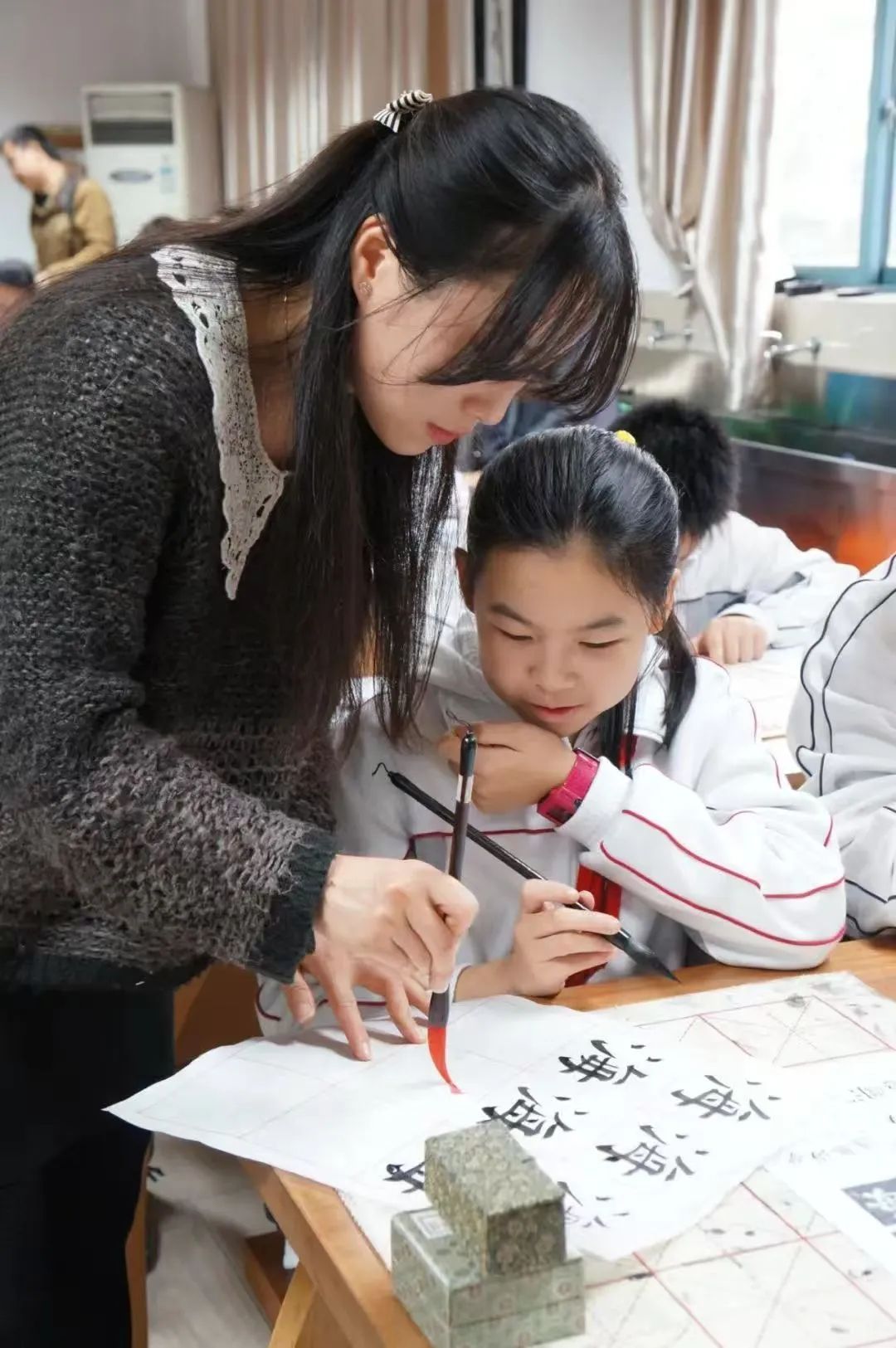 莘城学校自2004年建校以来,始终秉承“快乐学习,智慧成长,多元发展”的校训,致力于为学生提供全面而优质的教育,强调人格塑造与智能培养的和谐统一。姚锐莉老师自2007年进入莘城学校以来,就一直担任班主任,十多年来已经成长为莘城班主任团队的骨干力量,姚老师认为,作为班主任很重要的一个方面是和孩子建立起情感连接,能够敏锐地感知孩子在校时的情绪变化,感知孩子生活中的点滴变化。“当孩子遇到困难时,我们班主任应该义无反顾地关心自己班的孩子,并且将自己当作家人对待他们,让每个孩子渡过难关,”姚老师说道,“这是班主任的责任。”学校还不断推进落实“全员导师制”工作,充分挖掘每一位教师的闪光点和内在潜能,引领每一位教师都成为优秀的德育工作者,并以此为契机,着力推动高质量育人体系的建设。莘城学校的书法教育也尤为突出,已成为其教学的一大亮点和校园文化的核心组成部分。通过开设书法校本课程,莘城学校让学生从小学阶段就开始接触并学习书法,直至中学阶段逐渐深入,形成了一套完整的书法教育体系。陆春蕾老师2006年加入莘城学校后担任书法老师,那时上海市尚未开设书法课程,因此学校的书法团队“白手起家”,于2007年推出第一套校本课程。目前,莘城的书法校本课程已经覆盖一至九年级,并衍生出以书法为主体的系列美育校本课程。