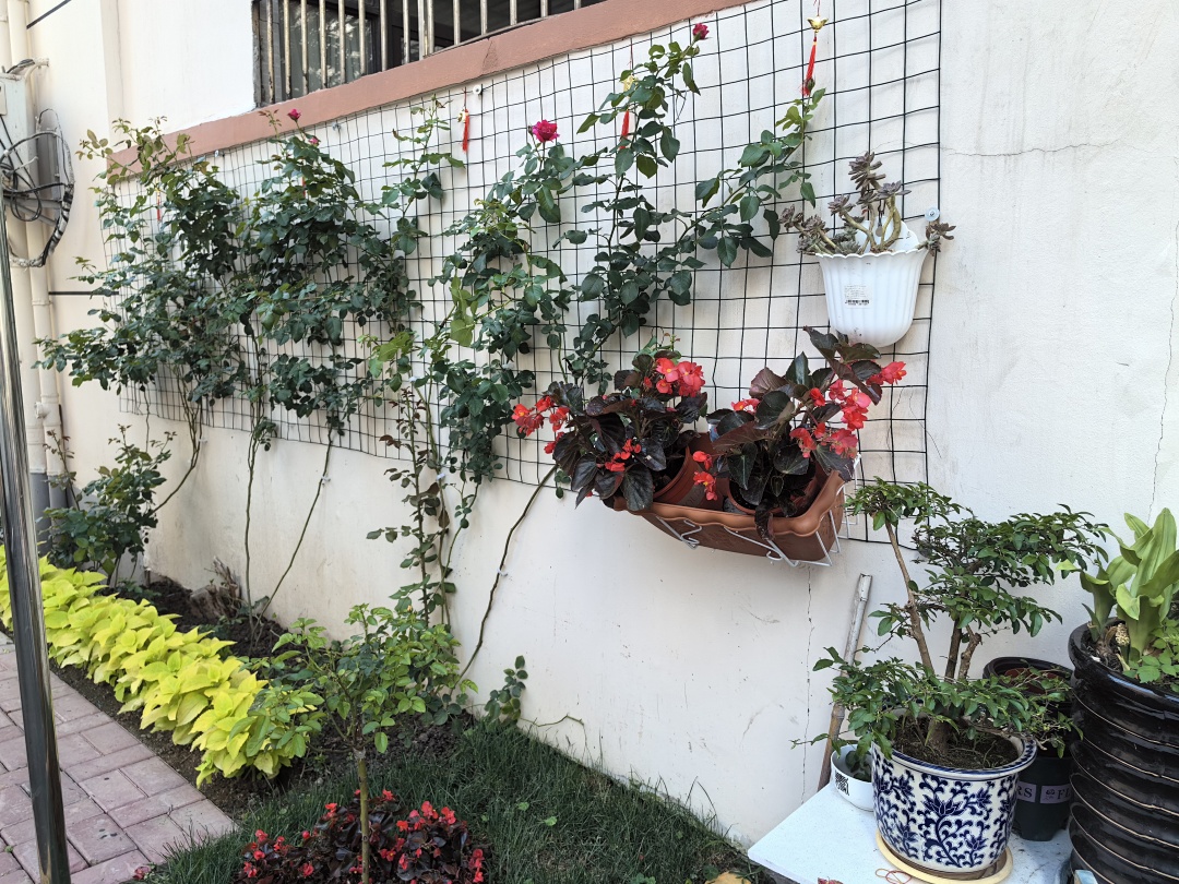除了大楼自管之外,居民们又对楼外的绿化和环境进行了美化升级。大家充分发挥各自爱好特长,自发出钱出力买花、种花、护花,因地制宜地对绿化的层次色彩品种进行重新布置,打造了多块绿化长廊、特色蔷薇多彩墙、悬挂立体花架,以及墙面山水风景绘画等。