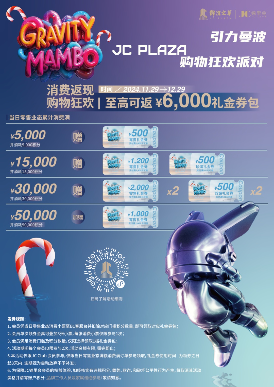 多倍积分、消费返现、惊喜抽奖、灵感商城,多重尊享,重磅来袭;还有JC CLUB锦里会会员年末回馈,引力曼波滚滚乐、新人入会礼遇、圣诞优先升级、TOP会员消费礼赠加码,倾情回馈,真挚礼遇。丰富活动层层递进,持续升温,点燃冬季。