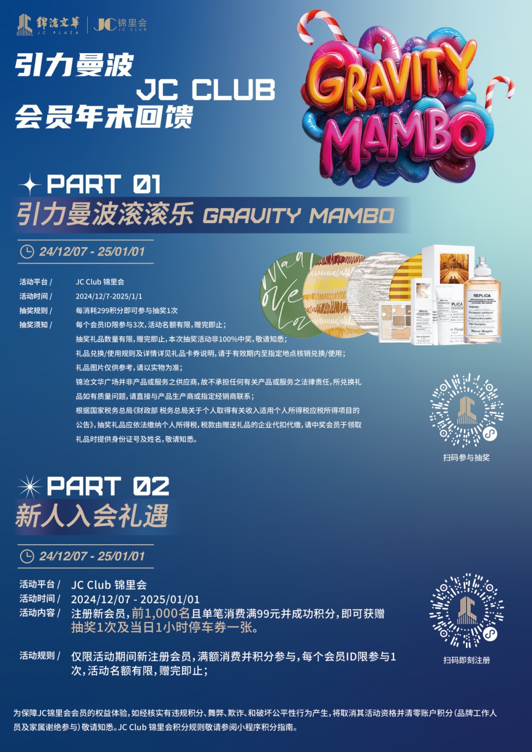 坐落于静安区核心的锦沧文华广场(JC PLAZA),拥有着深厚的历史底蕴,见证了城市变迁,承载着无数城市记忆,更是曾经的上海地标建筑。随着时代的更迭和日益多元的需求,锦沧文华广场不断更新升级,经过两年的引力存蓄,完成了探索转型的征程,从沪上知名五星级酒店成功转变为复合型高端综合商业体。 近日,“Gravity Mambo引力曼波”锦沧文华广场两周年庆派对及“JC PLAZA X ROBBi”潮流艺术特展开启。 四大主题装置贯穿JC PLAZA的室内外空间,ROBBi穿越虫洞的宇宙冒险,带领大家一起坠入浪漫星河,想象一场点燃冬季的星际之旅。活动将持续至2025年2月23日。 Gravity,象征极致吸引,平衡世界。Mambo,代表自由摇摆,舞动节奏。 ROBBT跳出“星信之杖”的拐杖丛林,发送引力波的信号,为每一位到场者接入星际之旅;突破时空束缚,跌入错落的“引力裂隙”,来到JC Galaxy;步入“镜像时空”的平行宇宙,在无限镜像中创造光影奇观;最终到达“时空折痕”,定格正在跳跃的欢乐瞬间,定格“引力曼波”的终极狂欢。 这不仅是一场关于宇宙和想象的星际奇遇,更是JC PLAZA特别打造的年末购物狂欢派对。 多倍积分、消费返现、惊喜抽奖、灵感商城,多重尊享,重磅来袭;还有JC CLUB锦里会会员年末回馈,引力曼波滚滚乐、新人入会礼遇、圣诞优先升级、TOP会员消费礼赠加码,倾情回馈,真挚礼遇。丰富活动层层递进,持续升温,点燃冬季。 锦沧文华广场(JC PLAZA),是一座集高端办公与精致购物于一体的复合型商业体。其前身为锦沧文华大酒店,历史可追溯至1900年的沧洲饭店,见证了上海百余年的繁荣变迁。