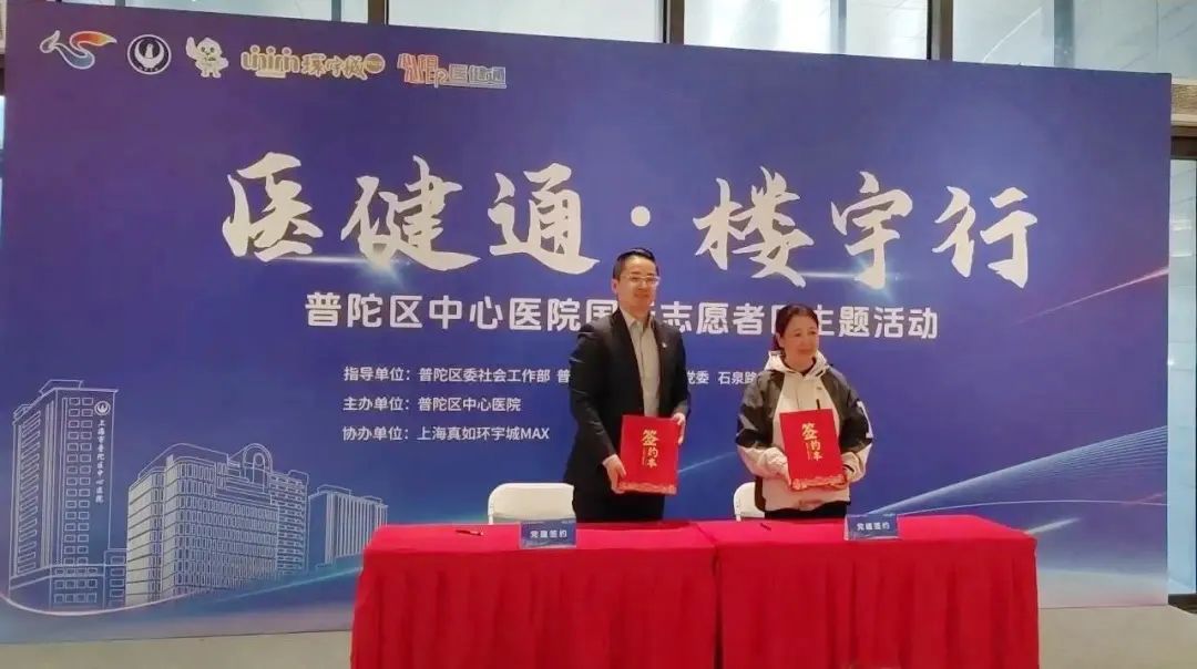 活动现场,普陀区中心医院全新打造的健康科普项目——“医健通·楼宇行”正式启动。中海环宇城第一党支部与普陀区中心医院门诊党支部签署党建共建协议。