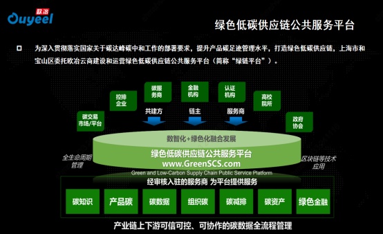 欧冶云商在市发展改革委和宝山区政府的支持下,联合社会各方资源,运用联盟区块链技术,打造绿色低碳供应链公共服务平台(简称“绿链平台”)。该生态平台聚焦供应链各环节,完善提升产品碳足迹标准计量、数据采集,实现了从上游生产到下游使用全流程中货物、资金、信用、交付的可视可控和安全,使上下游企业能够更加便捷地获取碳减排信息和技术支持,助力全行业碳排放的精准管理和有效控制。除此之外,绿链平台还建立了一套符合国情市情、衔接国际规则的产品碳足迹管理体系,打造面向供应链的核算模型集、碳足迹数据库以及全链条的高质量本土碳因子数据库,促进了碳足迹国际国内衔接互认,提升了中国在生态协同与降碳减排产业发展方面的国际话语权,推动经济社会绿色低碳转型发展。