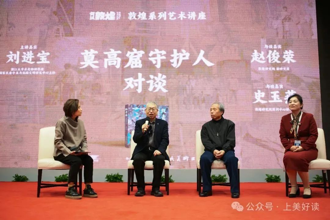 在讲座之后,刘进宝教授、敦煌的两位“当代莫高守护人”——赵俊荣老师及史玉燕老师以对谈的形式,与观众展开一场题为“莫高窟守护人”的深入探讨。他们为观众带来在敦煌工作、生活以及莫高精神三者熏陶之下的生动故事,讲述他们与敦煌艺术的不解之缘,并从专业的角度为我们解读敦煌壁画的艺术魅力、临摹的故事以及敦煌壁画临摹的重要意义。