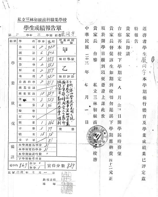 1932年8月,严同宇在强恕小学顺利毕业,考入私立三林初级商科职业学校第三届。同班学生有20多人。1934年7月,他的学习成绩报告单上的评语是“赋性忠实,勤于学习”。1935年7月学期满,他以全班第二名的成绩毕业。