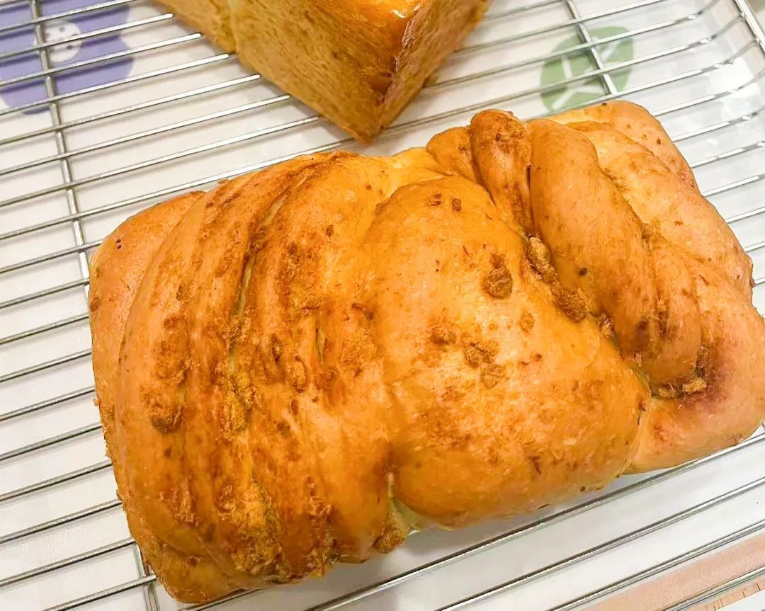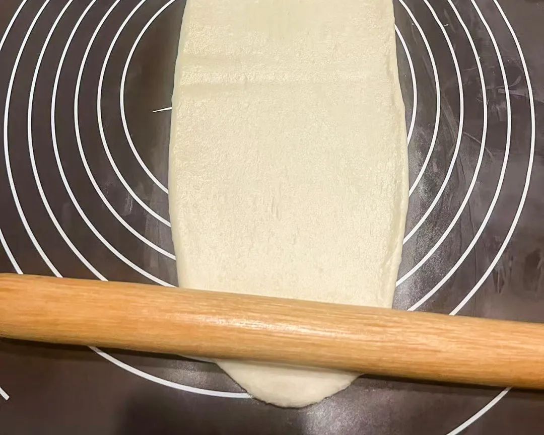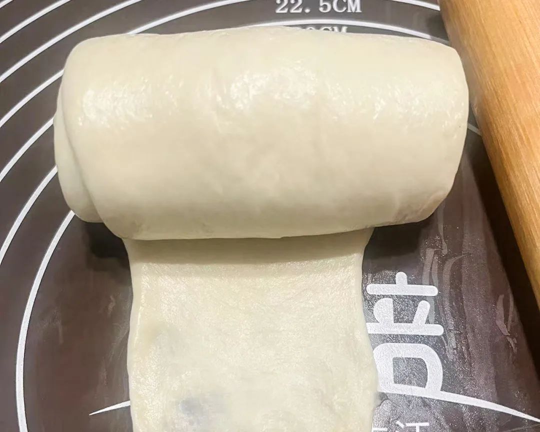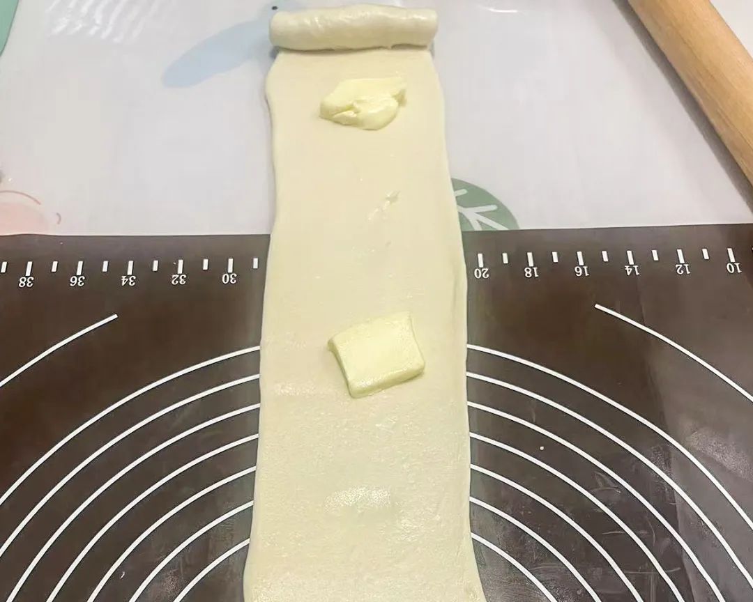 每隔一段放一块黄油(这里的黄油也可以替换成肉松、坚果、果干、红豆、豆沙、椰蓉、谷物、黑芝麻、巧克力等,变成各式各样口味的吐司),慢慢卷起来