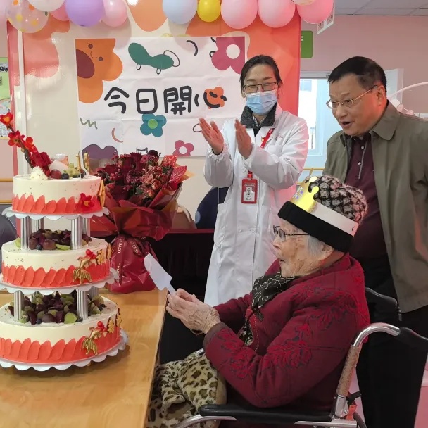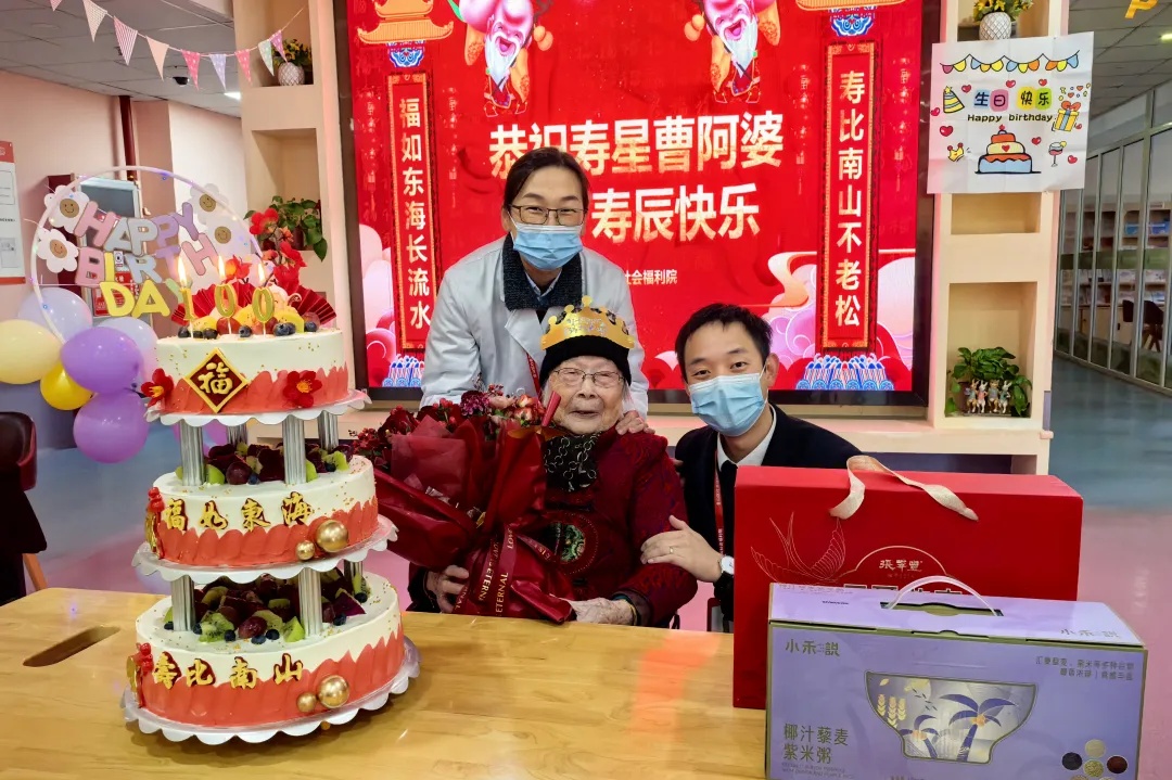 “我妈妈迎来百岁生日,离不开福利院全体工作人员的悉心照料,真的太感谢你们了。”曹阿婆的家属表示,这次来福利院不仅是为母亲过生日,还要将一面写有“百岁长寿全靠党 健康快乐福利院”的锦旗赠送给福利院全体工作人员,表达对他们的感谢。据介绍,曹阿婆出生于1924年,今年100岁高龄,但她仍精神矍铄、眼明心亮。自2010年入住区社会福利院以来,她与悉心照护她的工作人员早已变成亲人。