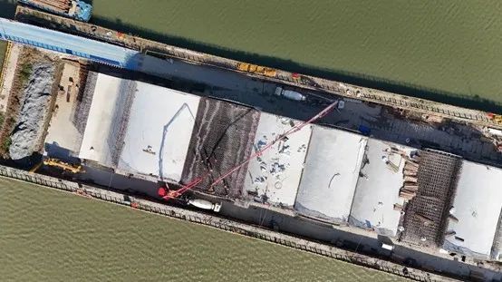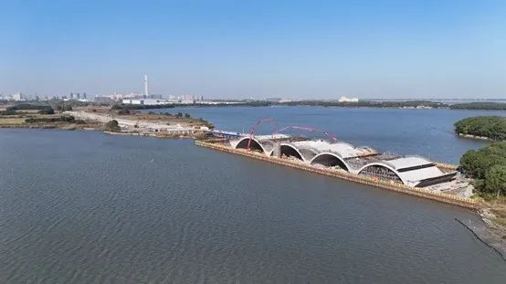 浦港路东延工程是水乡客厅重点建设项目。一期项目西起吴江区思古甸港,向东跨越雪落漾,连接青浦区沪青平公路,全长2289.34米,规划道路等级为城市次干路,布局为双向4快2慢规模。沿线包含1座跨湖桥梁和5座跨河桥涵,其中雪落漾桥位于上海市和江苏省交界处。这座全新的桥梁为9跨上承式拱桥,主桥跨径达到280米,正在加紧施工建设中。第一阶段的4拱施工已经接近完成,并在雪落漾湖荡中央位置的省界交汇处实现了合龙。目前第二阶段的围堰施工即将开始。