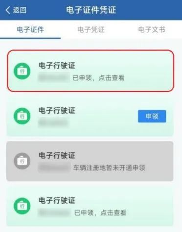 个人用户登录“交管12123”App,点击首页“电子证件凭证”功能,进入“电子证件”子功能。用户名下有机动车的,可点击电子行驶证右侧的【申领】按钮进行申领。