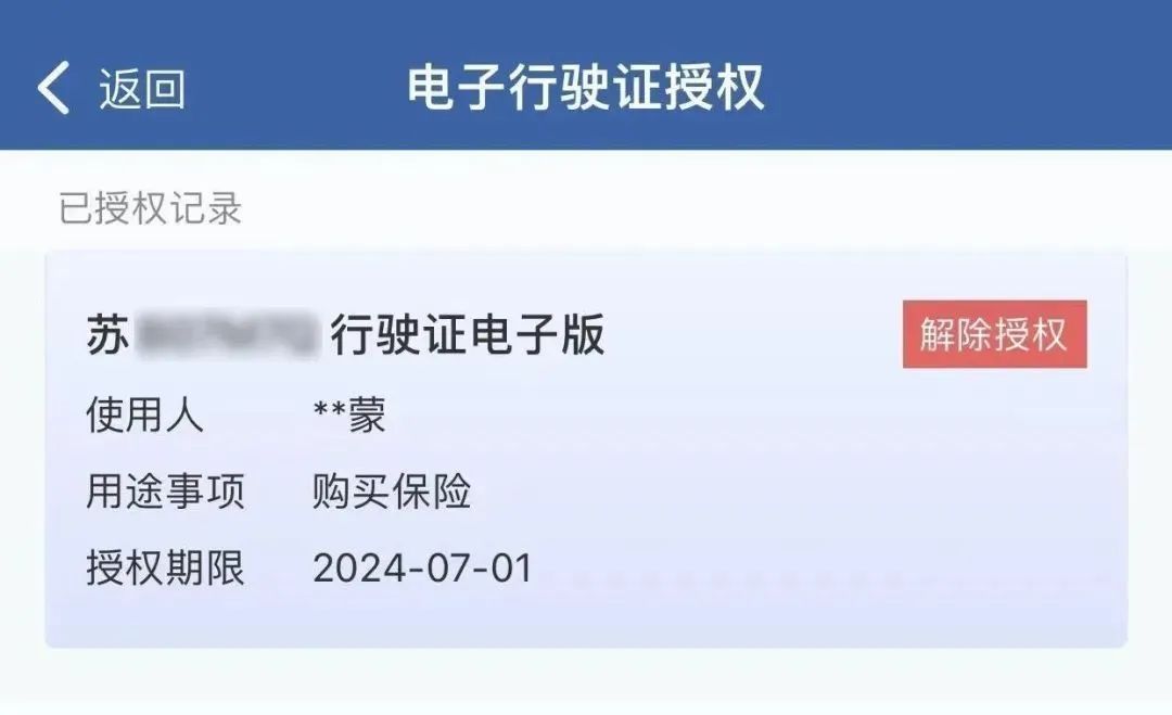 授权有效期最长为7个工作日。机动车所有人或单位法人、车辆管理人员可在授权列表中点击【解除授权】按钮中途解除授权,解除授权或授权到期后电子行驶证自动作废,被授权人“交管12123”App不再显示。