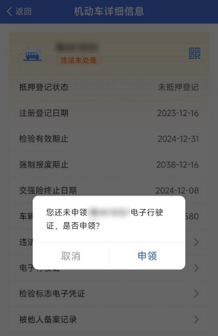 单位用户登录“交管12123”App切换到单位用户版后,在首页下方点击机动车列表项后,进入“机动车详细信息”页面,点击【电子行驶证】进行申领。