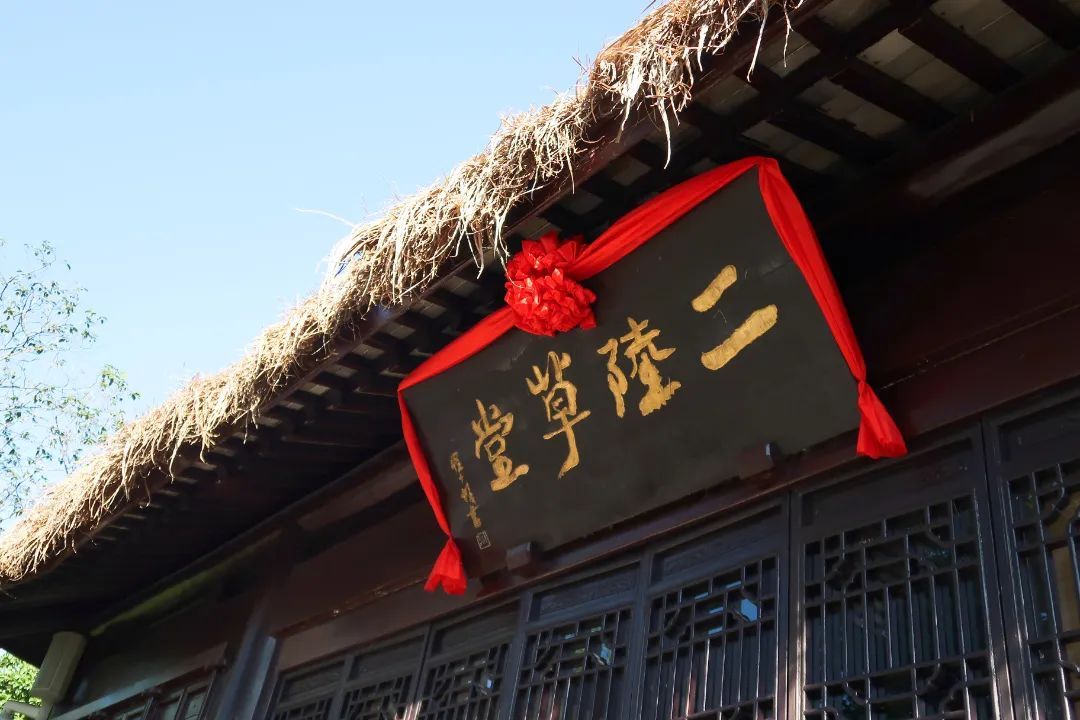据了解,二陆草堂此次修缮保留了建筑外部红漆木门和茅草顶的古朴造型,并在建筑结构和周边环境上进行了优化,融合了历史感与现代功能。门前悬挂的“二陆草堂”和“太康之英”牌匾,依然诉说着陆机与陆云的文学成就与风采。