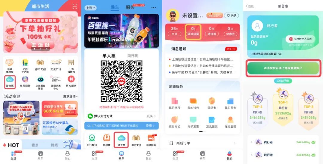 授权出行场景后,使用Metro大都会(APP端乘车码)出行即可在上海市碳普惠专区产生减排量。