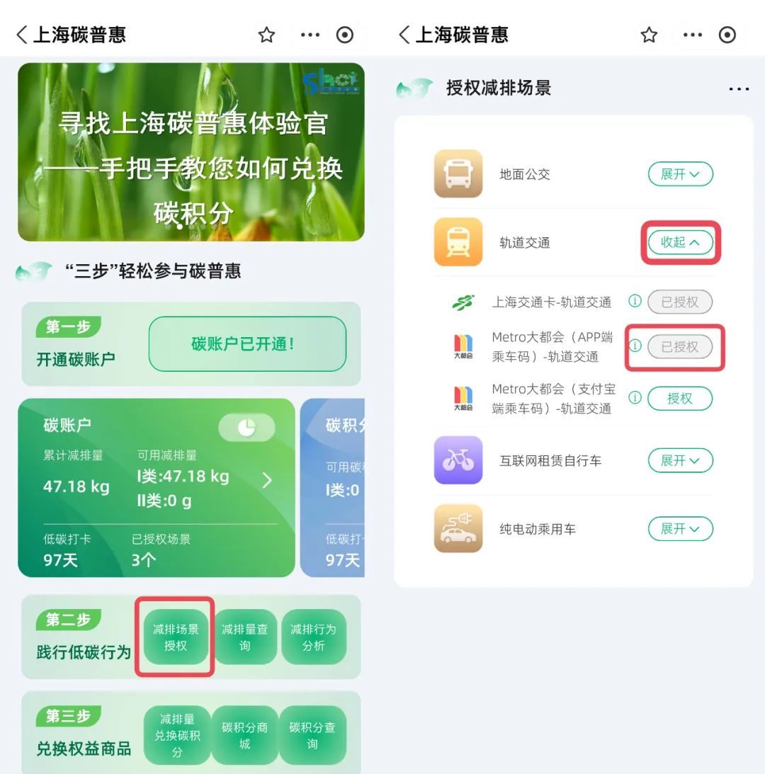 在随申办小程序或随申办APP中打开“上海碳普惠专区”,点击“减排场景授权”,展开“轨道交通”并选择“Metro大都会(APP端乘车码)”进行授权,即可完成Metro大都会(APP端乘车码)授权。