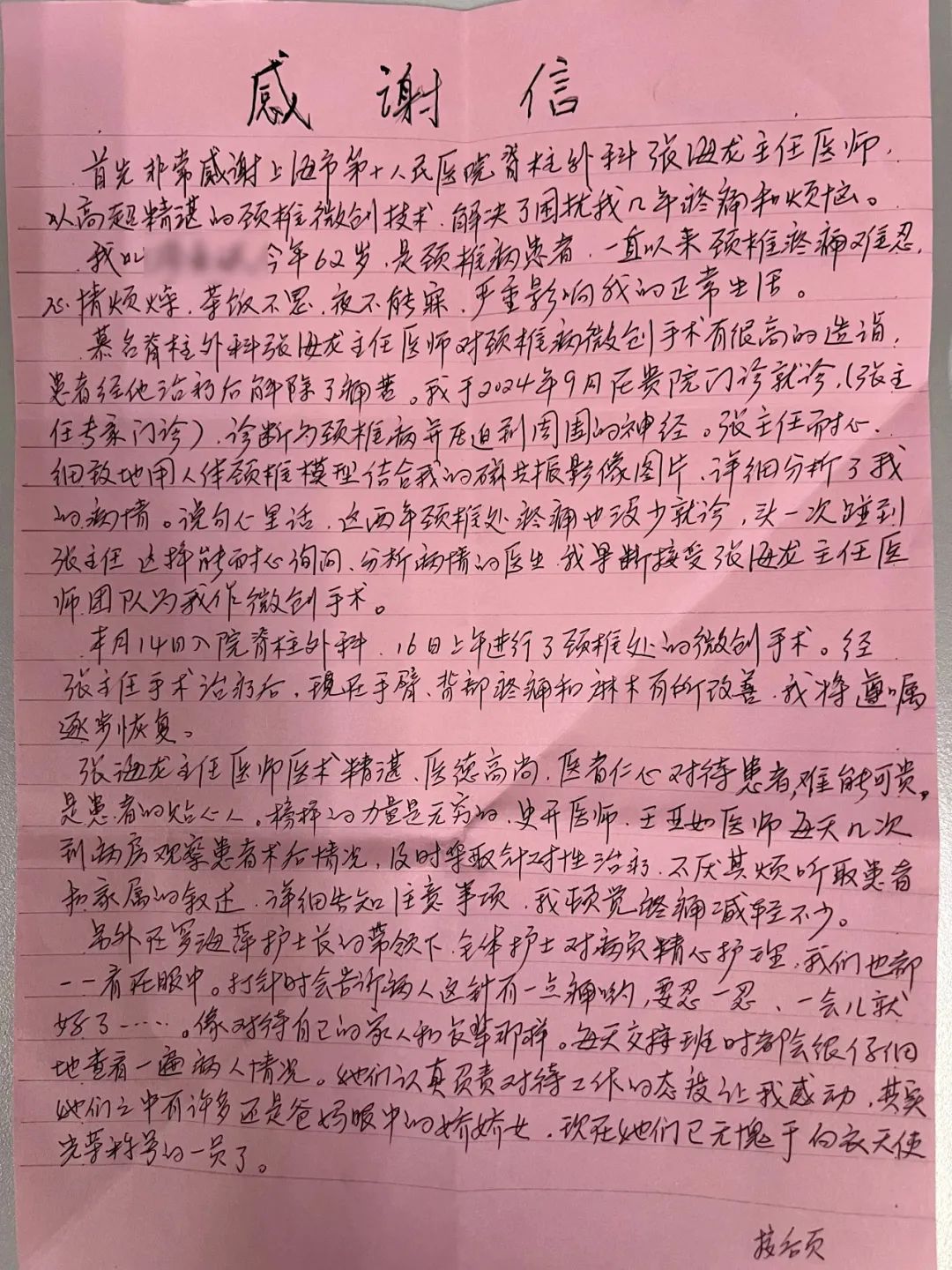 “心情烦躁、茶饭不思、夜不能寐……”一打开上海市第十人民医院脊柱外科患者缪先生写来的感谢信,疾病造成的威压感扑面而来——严重的神经根型颈椎病引发持续超过两年的颈部和手臂酸胀麻痛。
