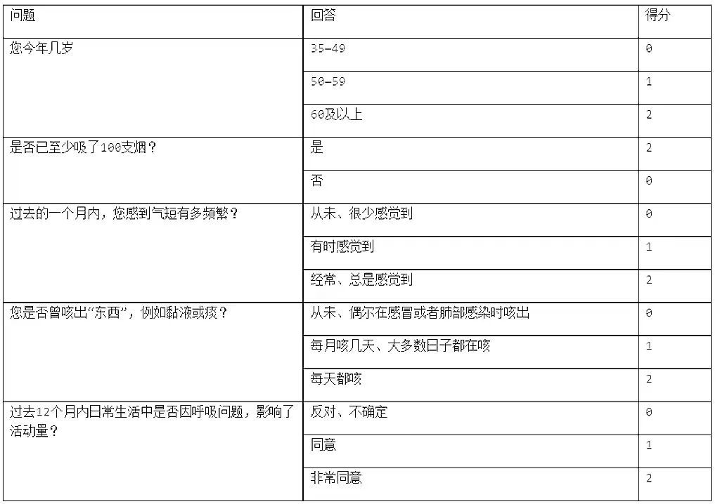 居民可以通过近期呼吸状况和活动能力做以下自评式问卷(COPD-PS)评分,里面包含5个选择题。