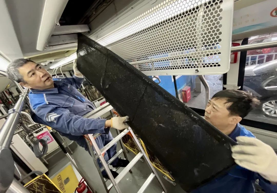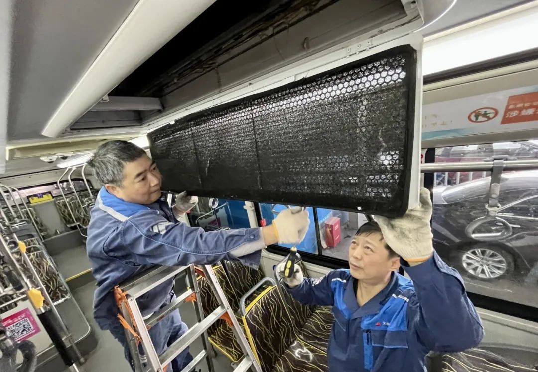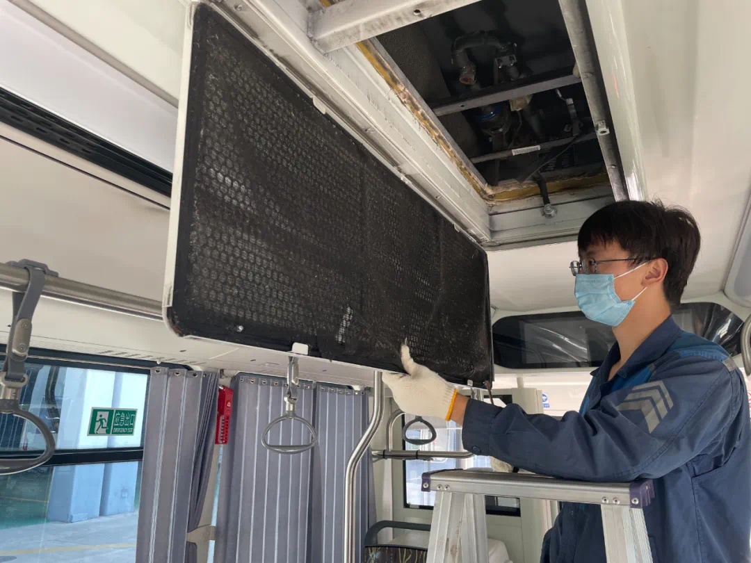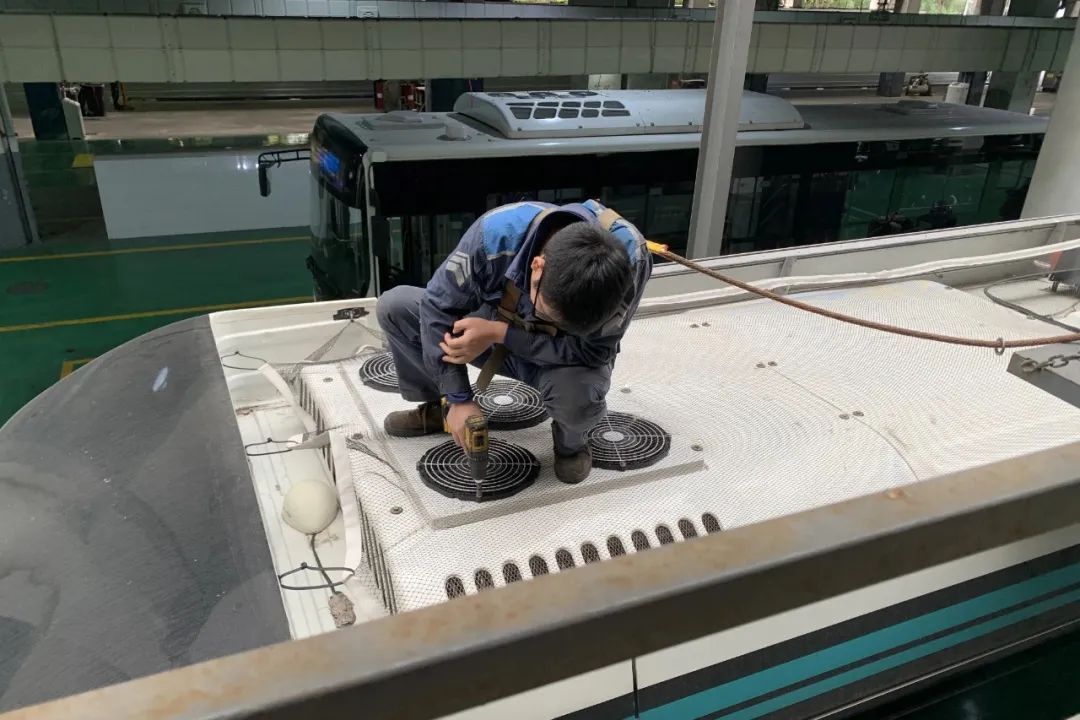 同时,在修理车间作业区,工作人员对车厢内部空调出风口及过滤网罩进行清洁,对公交车顶冷凝器、蒸发器部件进行维护,仔细检查高压电器系统、各类风机的运转情况,严格做到发现故障及时修复。