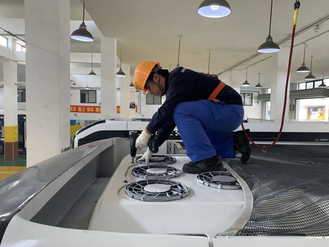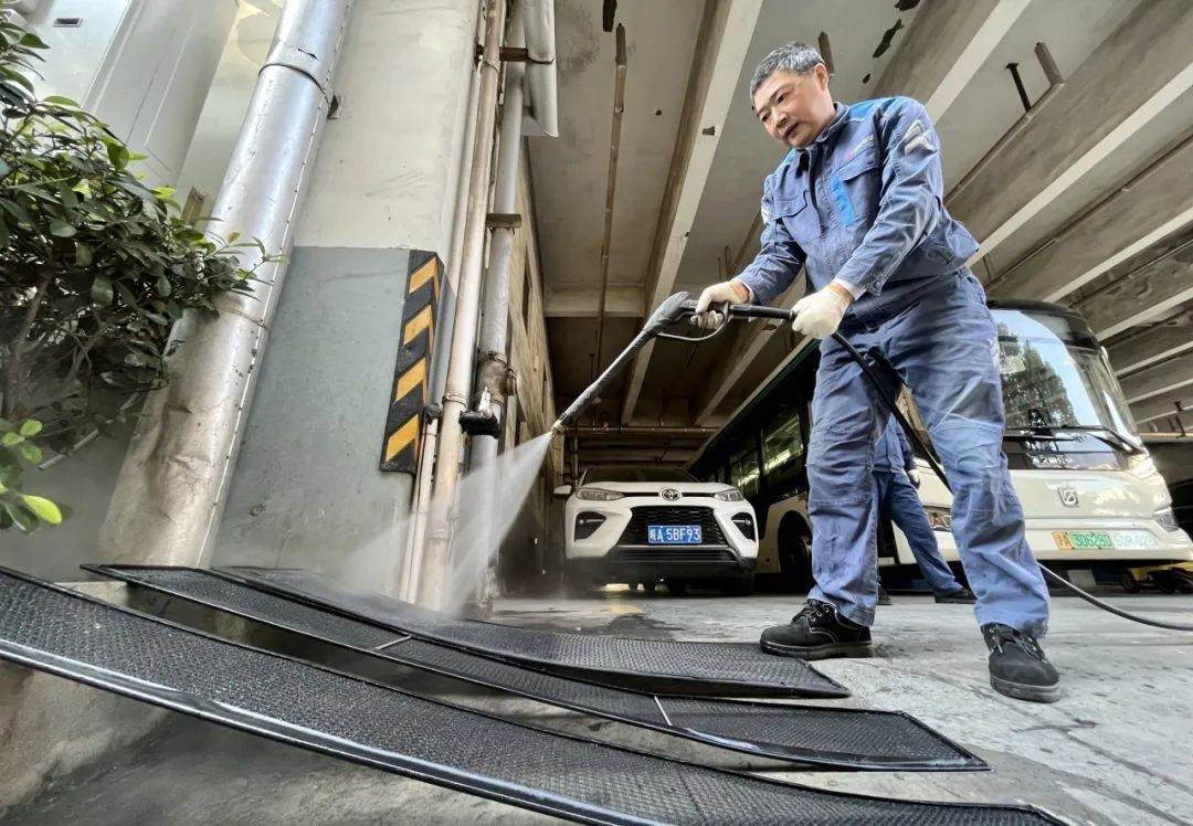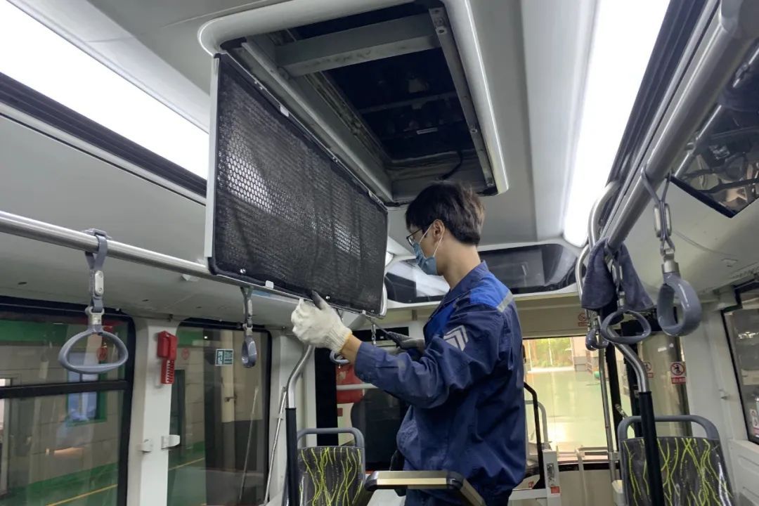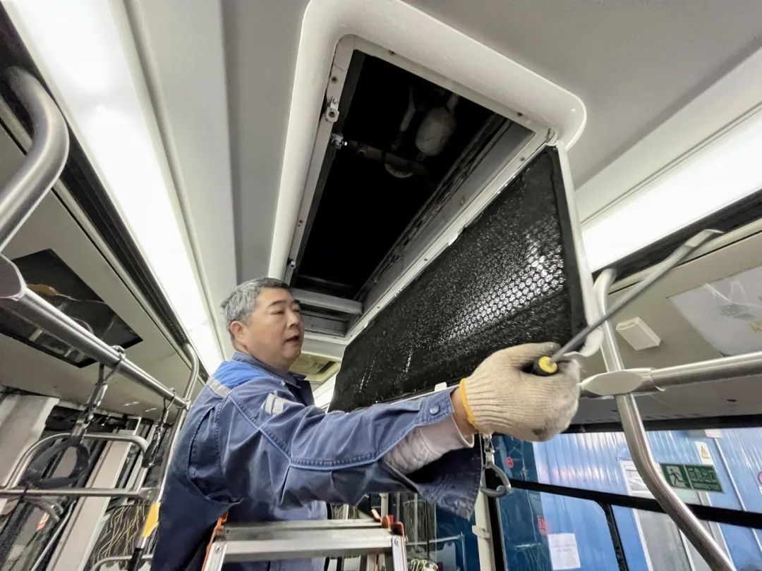 同时,在修理车间作业区,工作人员对车厢内部空调出风口及过滤网罩进行清洁,对公交车顶冷凝器、蒸发器部件进行维护,仔细检查高压电器系统、各类风机的运转情况,严格做到发现故障及时修复。