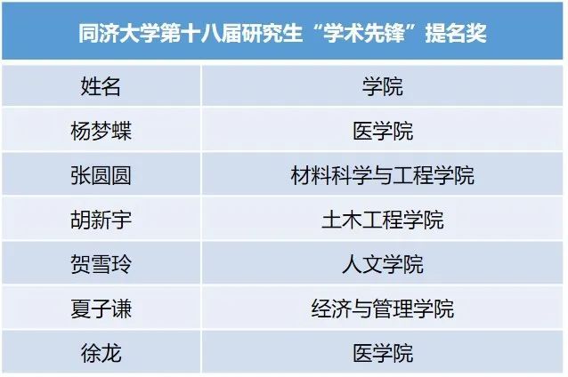附:同济大学第十八届研究生“学术先锋”提名奖获得者名单(按姓氏笔画排序)
