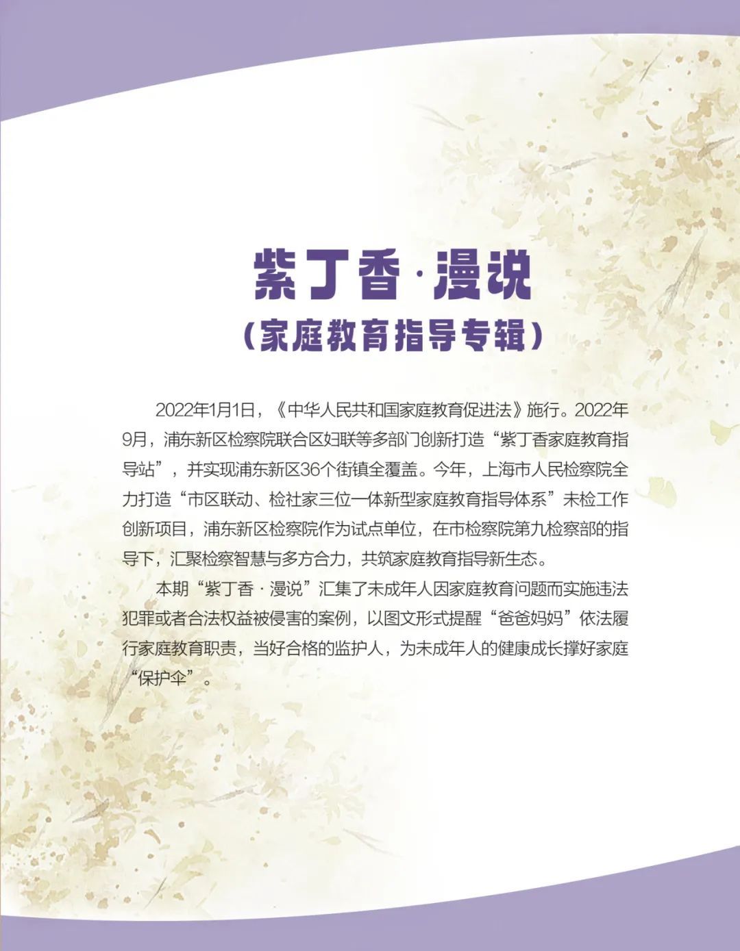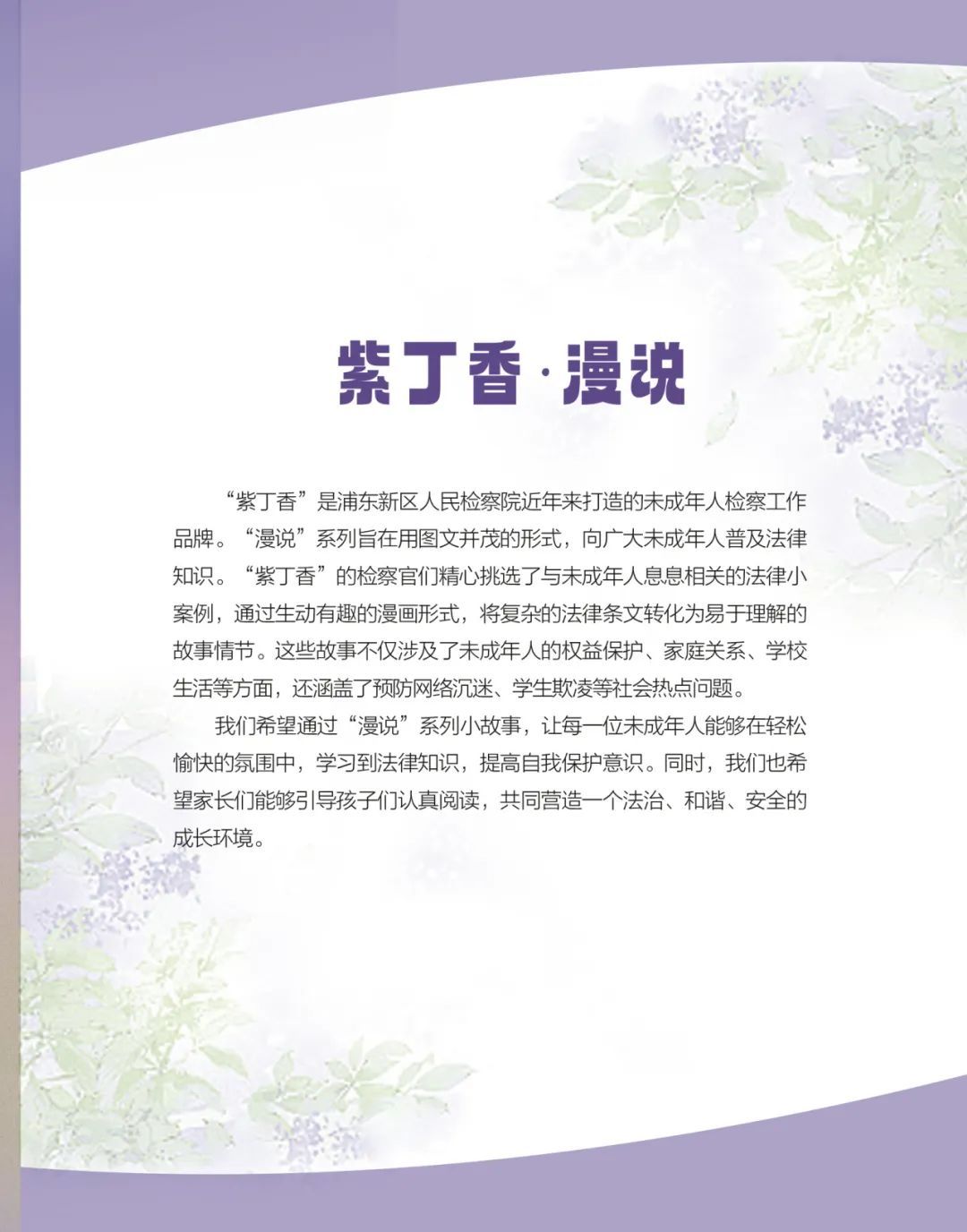 今年,浦东新区检察院作为上海市人民检察院全力打造的“市区联动、检社家三位一体新型家庭教育指导体系”未检工作创新项目的试点单位,精心推出“紫丁香·漫说”系列普法漫画册,并得到了区妇联的大力支持。
