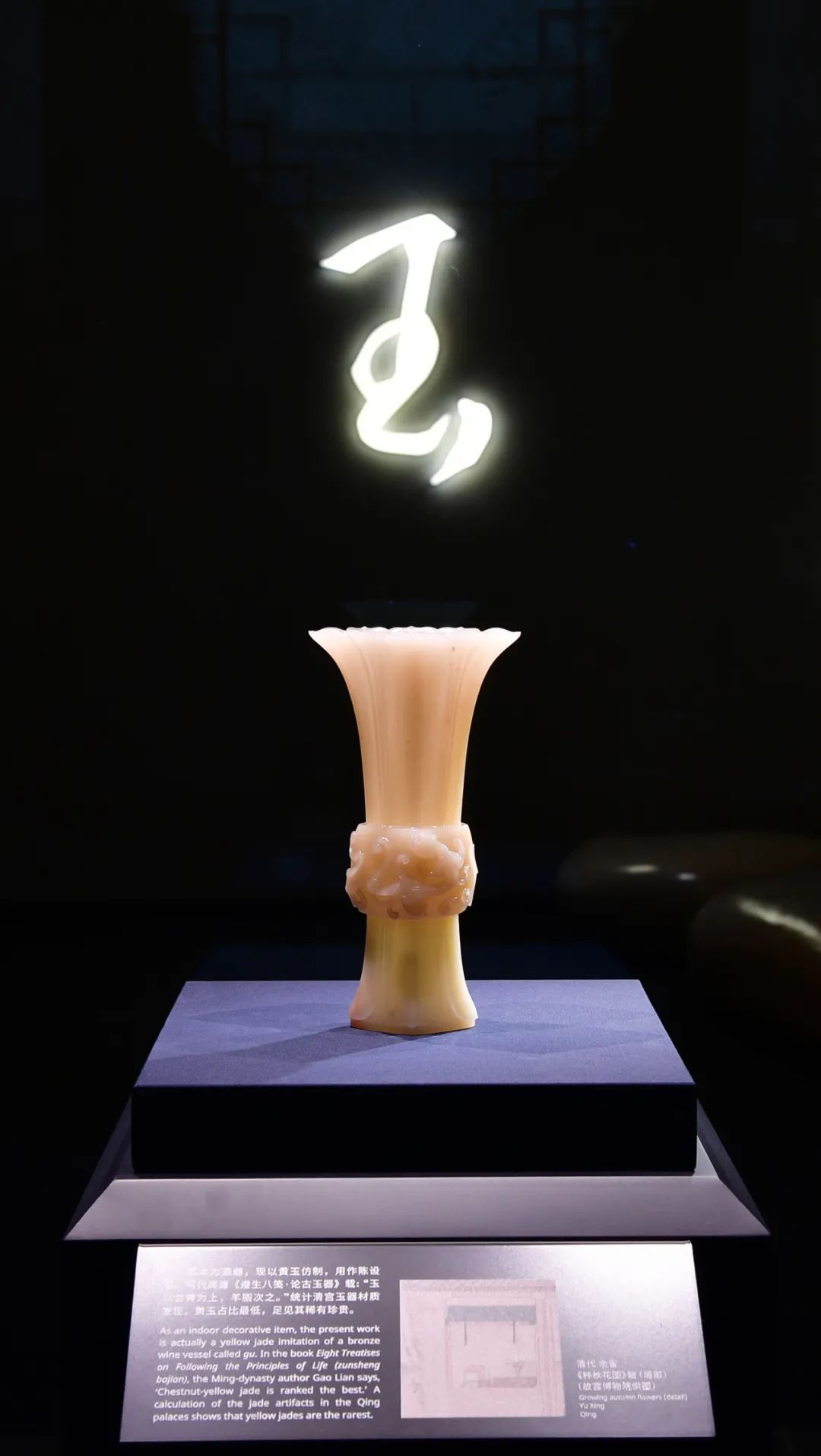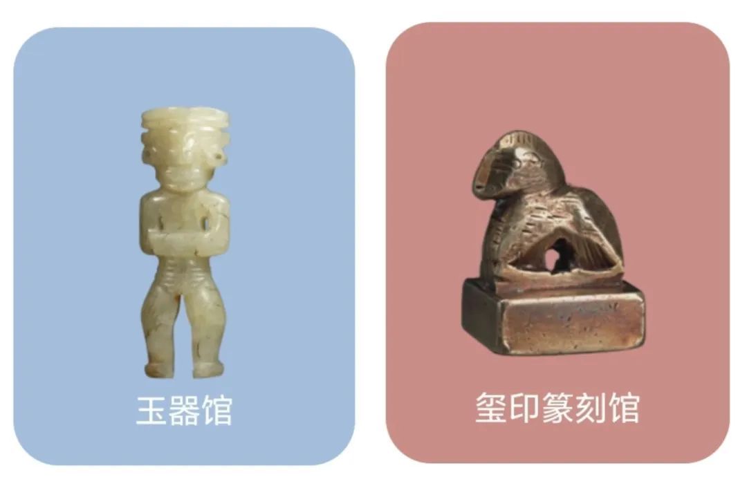 东馆玉器馆延续通史框架,展出自新石器时代至清代的360件组馆藏玉器(原人广馆展出260件组),并增补绿松石、玛瑙、翡翠作品,完善观众对古代玉器用材及发展的认知。挑选近80件重点展品进行阐释或拓展说明,辅以线图、拓片、使用复原图或动画,以及同期其他门类的相关艺术品等。多角度讲述,“轻”学术落地,以帮助观众深入了解中国古代玉器的发展历程、功能演化和历史文化价值。