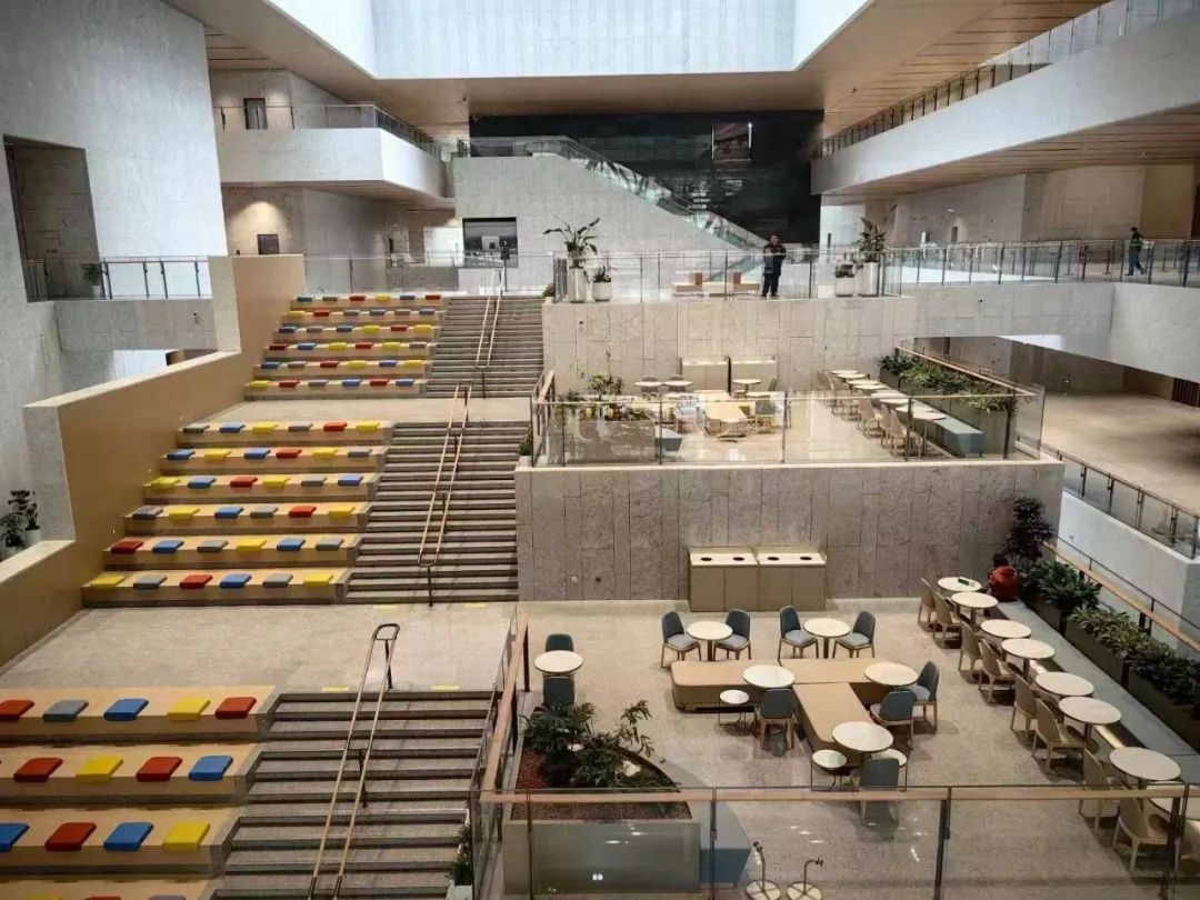 走进上博东馆,许多观众会感觉与传统博物馆“不太一样”——上博在建筑设计上强调开放性,打破了传统博物馆的封闭空间,每个楼层都有落地玻璃、平台或户外区域,引入自然光线,让建筑呼吸,让观众“透气”,从而获得视觉和审美转换,缓解“博物馆疲劳”。功能设置上,每个楼层走廊一侧和厕所门口,都设置了椅子,供观众短暂休息。中庭连接一二三层的楼梯区集中设置了阶梯座位。阶梯座位的另一侧平台,销售矿泉水、茶、果汁、咖啡、三明治、蛋糕、慕斯等各类饮品和食品,观众点单消费后,可以边品尝美食,边放松休闲。